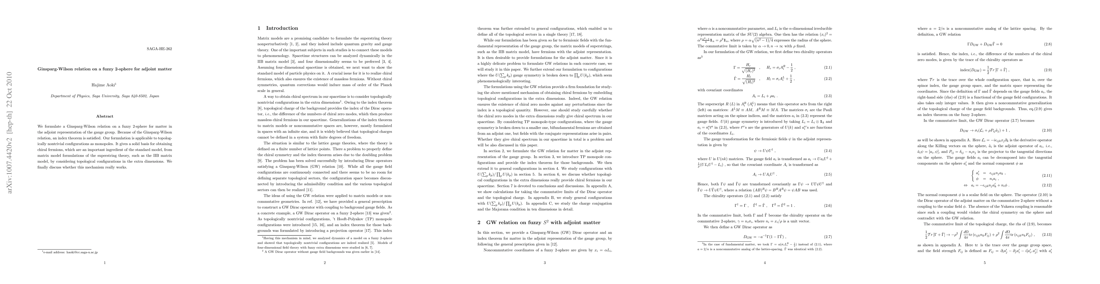 This paper formulates a Ginsparg-Wilson relation on a fuzzy 2-sphere for adjoint matter, providing a basis for obtaining chiral fermions relevant to the standard model from matrix model formulations of superstring theory, particularly for topologically nontrivial configurations like monopoles. The study explores the feasibility of this mechanism.