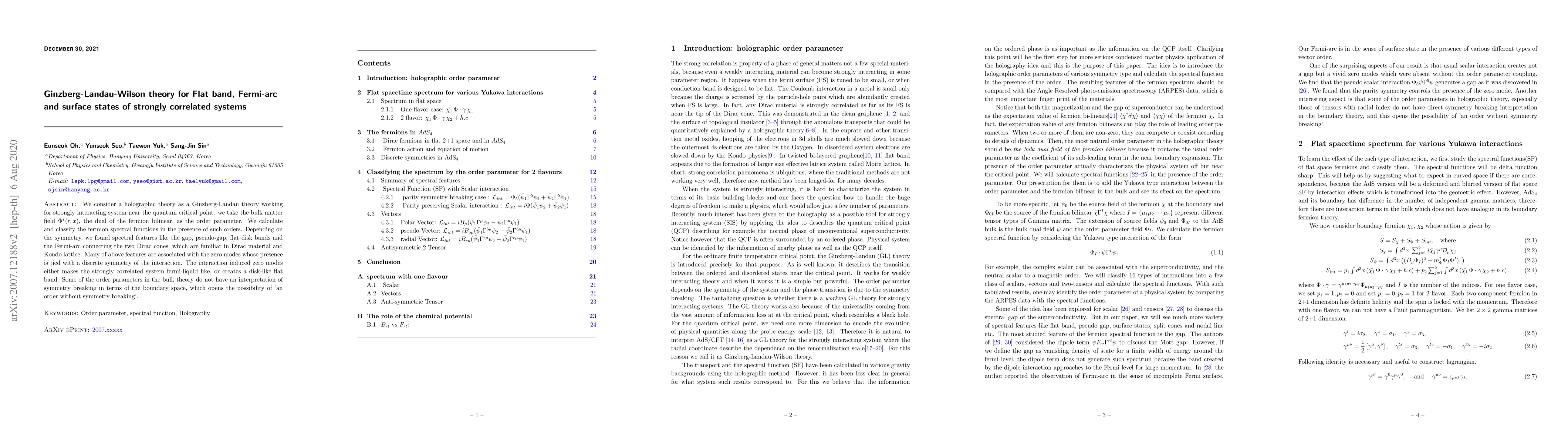 We consider a holographic theory as a Ginzberg-Landau theory working for strongly interacting system near the quantum critical point: we take the bulk matter field $\Phi^I(r,x)$, the dual of the fermion bilinear, as the order parameter. We calculate and classify the fermion spectral functions in the presence of such orders. Depending on the symmetry, we found spectral features like the gap, pseudo-gap, flat disk bands and the Fermi-arc connecting the two Dirac cones, which are familiar in Dirac material and Kondo lattice. Many of above features are associated with the zero modes whose presence is tied with a discrete symmetry of the interaction. The interaction induced zero modes either makes the strongly correlated system fermi-liquid like, or creates a disk-like flat band. Some of the order parameters in the bulk theory do not have an interpretation of symmetry breaking in terms of the boundary space, which opens the possibility of 'an order without symmetry breaking'.