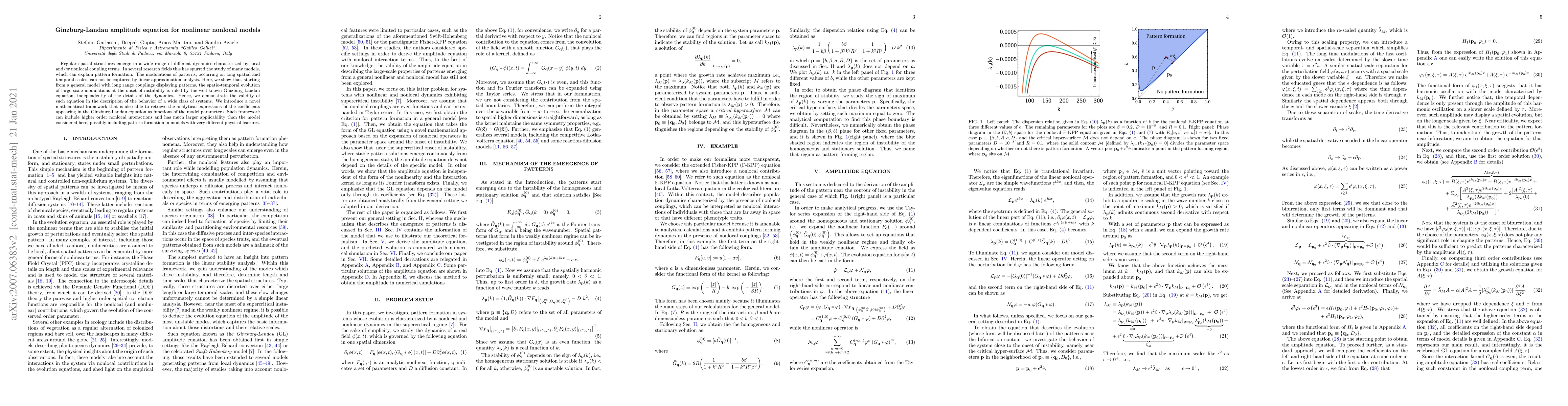 This paper explores the Ginzburg-Landau equation's applicability in describing large-scale modulations in nonlinear nonlocal models, revealing its validity across diverse systems. It introduces a novel mathematical framework to derive analytical expressions for the equation's coefficients, extending its applicability beyond the specific model considered.