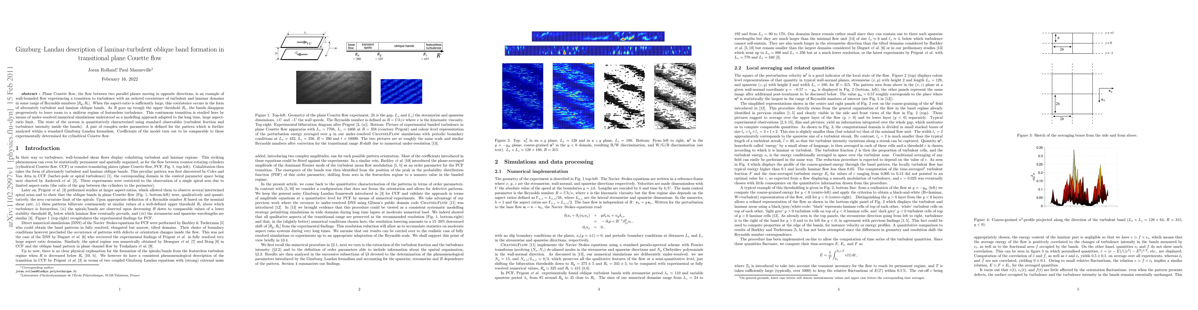 This paper investigates the transition to turbulence in plane Couette flow using Ginzburg-Landau theory, focusing on the formation of laminar-turbulent oblique bands. The study employs under-resolved numerical simulations to model the continuous transition from banded patterns to featureless turbulence.