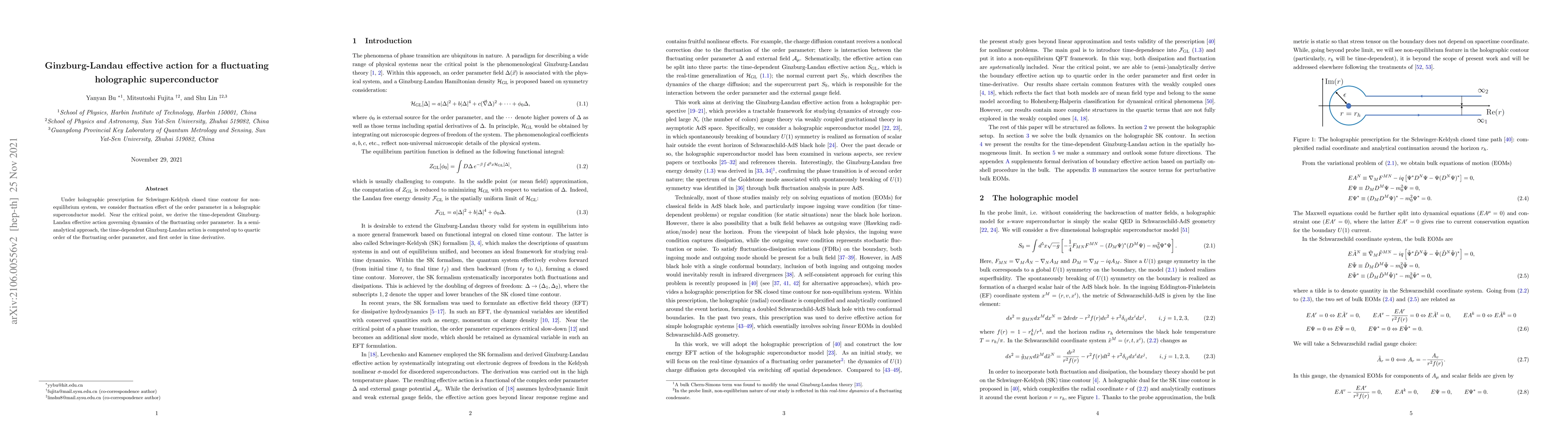 This paper derives the time-dependent Ginzburg-Landau effective action for a fluctuating holographic superconductor near the critical point, employing a semi-analytical approach to compute it up to quartic order in the order parameter and first order in time derivatives. The study uses the holographic prescription for a non-equilibrium system under the Schwinger-Keldysh closed time contour.