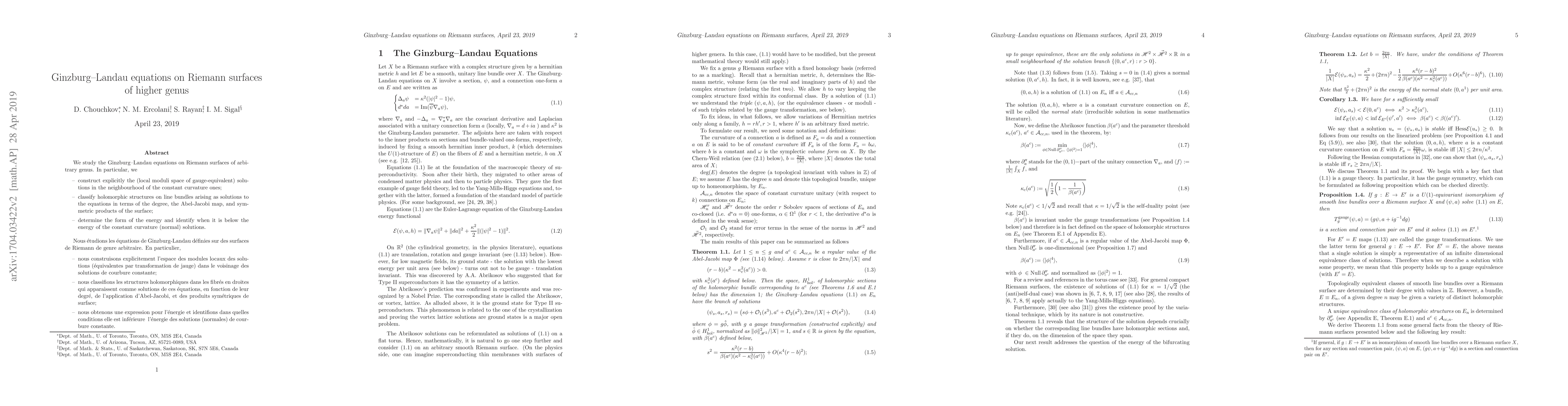 We study the Ginzburg-Landau equations on Riemann surfaces of arbitrary genus. In particular: - we construct explicitly the (local moduli space of gauge-equivalent) solutions in a neighbourhood of the constant curvature ones; - classify holomorphic structures on line bundles arising as solutions to the equations in terms of the degree, the Abel-Jacobi map, and symmetric products of the surface; - determine the form of the energy and identify when it is below the energy of the constant curvature (normal) solutions.