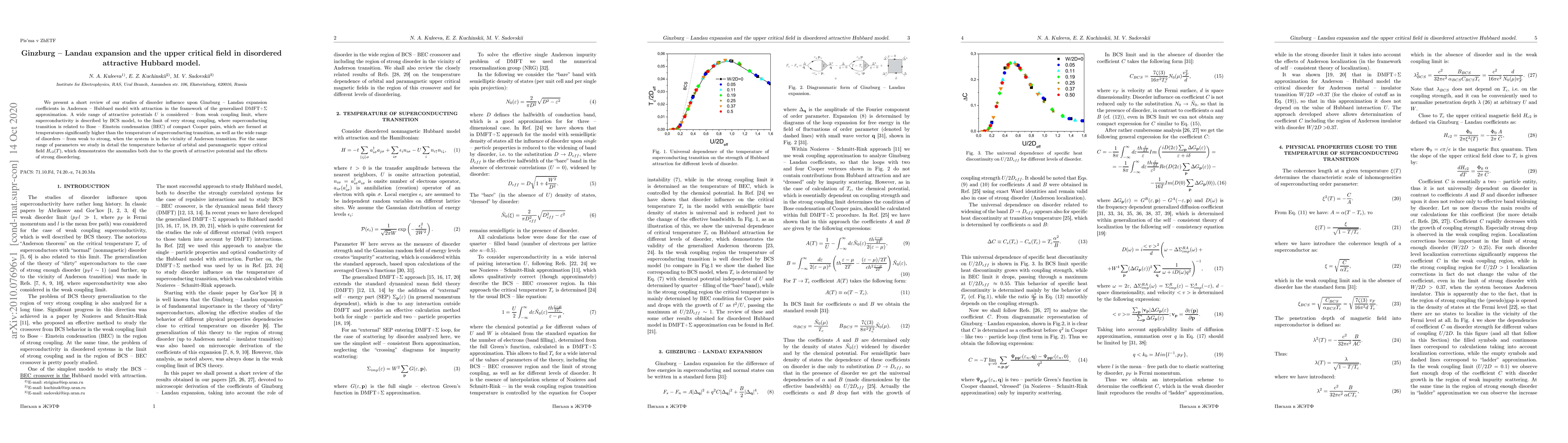 We present a short review of our studies of disorder influence upon Ginzburg - Landau expansion coefficients in Anderson - Hubbard model with attraction in the framework of the generalized DMFT+$\Sigma$ approximation. A wide range of attractive potentials $U$ is considered - from weak coupling limit, where superconductivity is described by BCS model, to the limit of very strong coupling, where superconducting transition is related to Bose - Einstein condensation (BEC) of compact Cooper pairs, which are formed at temperatures significantly higher than the temperature of superconducting transition, as well as the wide range of disorders - from weak to strong, when the system is in the vicinity of Anderson transition. For the same range of parameters we study in detail the temperature behavior of orbital and paramagnetic upper critical field $H_{c2}(T)$, which demonstrates the anomalies both due to the growth of attractive potential and the effects of strong disordering.