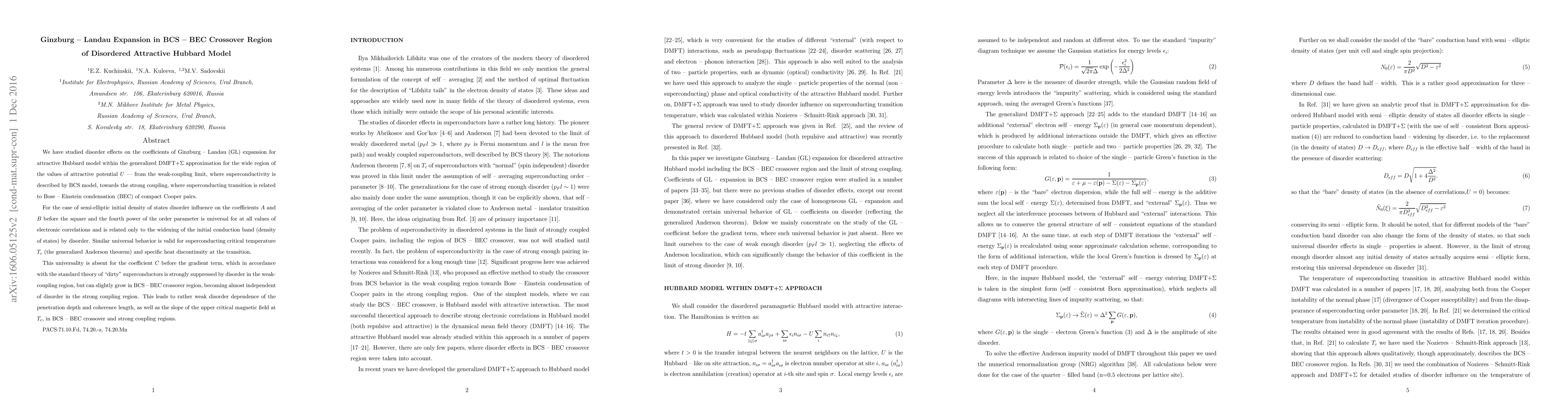 We have studied disorder effects on the coefficients of Ginzburg - Landau (GL) expansion for attractive Hubbard model within the generalized DMFT+Sigma approximation for the wide region of the values of attractive potential U - from the weak-coupling limit, where superconductivity is described by BCS model, towards the strong coupling, where superconducting transition is related to Bose - Einstein condensation (BEC) of compact Cooper pairs. For the case of semi-elliptic initial density of states disorder influence on the coefficients A and B before the square and the fourth power of the order parameter is universal for at all values of electronic correlations and is related only to the widening of the initial conduction band (density of states) by disorder. Similar universal behavior is valid for superconducting critical temperature T_c (the generalized Anderson theorem) and specific heat discontinuity at the transition. This universality is absent for the coefficient C before the gradient term, which in accordance with the standard theory of "dirty" superconductors is strongly suppressed by disorder in the weak-coupling region, but can slightly grow in BCS - BEC crossover region, becoming almost independent of disorder in the strong coupling region. This leads to rather weak disorder dependence of the penetration depth and coherence length, as well as the slope of the upper critical magnetic field at T_c, in BCS - BEC crossover and strong coupling regions.