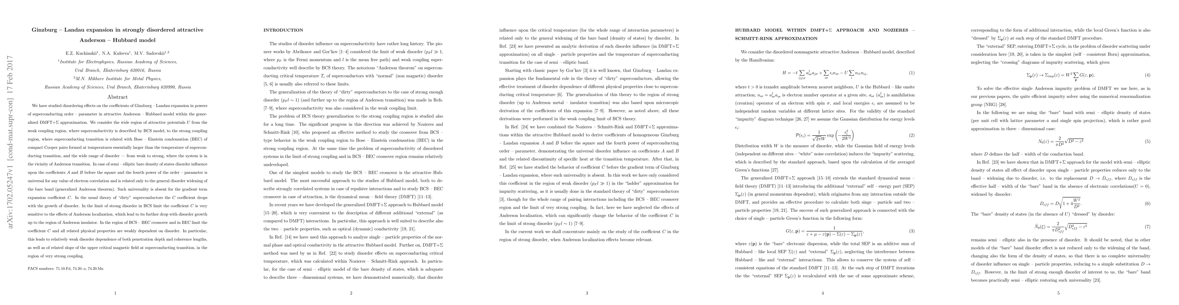 The paper presents a detailed analysis of the effects of disorder on Ginzburg-Landau coefficients and related physical properties in the disordered Anderson-Hubbard model with attraction, using advanced theoretical methods such as Nozieres–Schmitt-Rink approximation and DMFT+Σ.