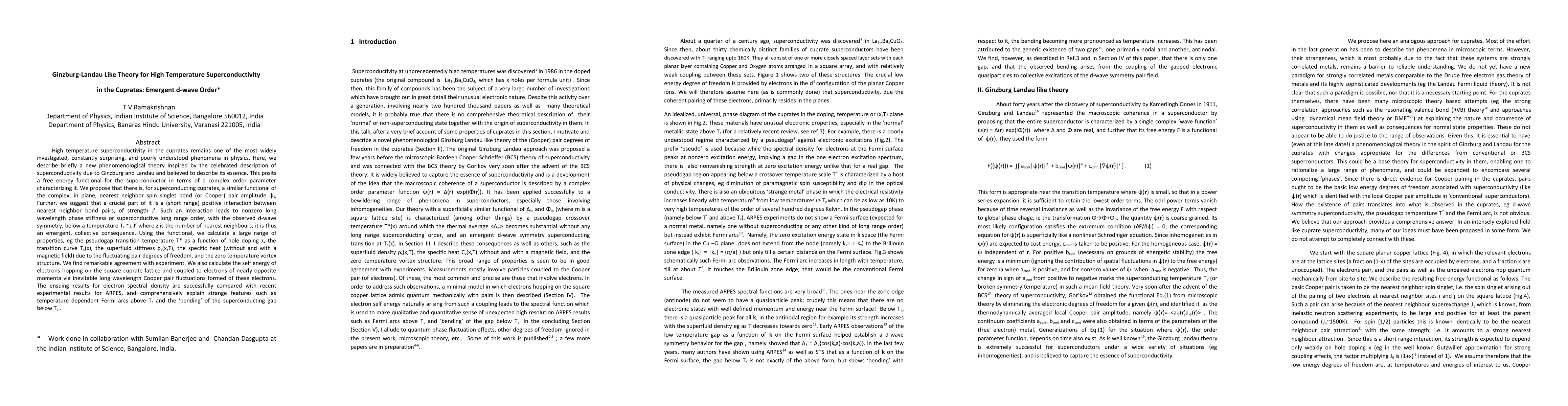 High temperature superconductivity in the cuprates remains one of the most widely investigated, constantly surprising, and poorly understood phenomena in physics. Here, we describe briefly a new phenomenological theory inspired by the celebrated description of superconductivity due to Ginzburg and Landau and believed to describe its essence. This posits a free energy functional for the superconductor in terms of a complex order parameter characterizing it. We propose, for superconducting cuprates, a similar functional of the complex, in plane, nearest neighbor spin singlet bond (or Cooper) pair amplitude psi_ij. A crucial part of it is a (short range) positive interaction between nearest neighbor bond pairs, of strength J'. Such an interaction leads to nonzero long wavelength phase stiffness or superconductive long range order, with the observed d-wave symmetry, below a temperature T_c\simzJ' where z is the number of nearest neighbours; it is thus an emergent, collective consequence. Using the functional, we calculate a large range of properties, e.g. the pseudogap transition temperature T* as a function of hole doping x, the transition curve T_c(x), the superfluid stiffness rho_s(x,T), the specific heat (without and with a magnetic field) due to the fluctuating pair degrees of freedom, and the zero temperature vortex structure. We find remarkable agreement with experiment. We also calculate the self energy of electrons hopping on the square cuprate lattice and coupled to electrons of nearly opposite momenta via inevitable long wavelength Cooper pair fluctuations formed of these electrons. The ensuing results for electron spectral density are successfully compared with recent ARPES experiments, and comprehensively explain strange features such as temperature dependent Fermi arcs above T_c and the 'bending' of the superconducting gap below T_c .