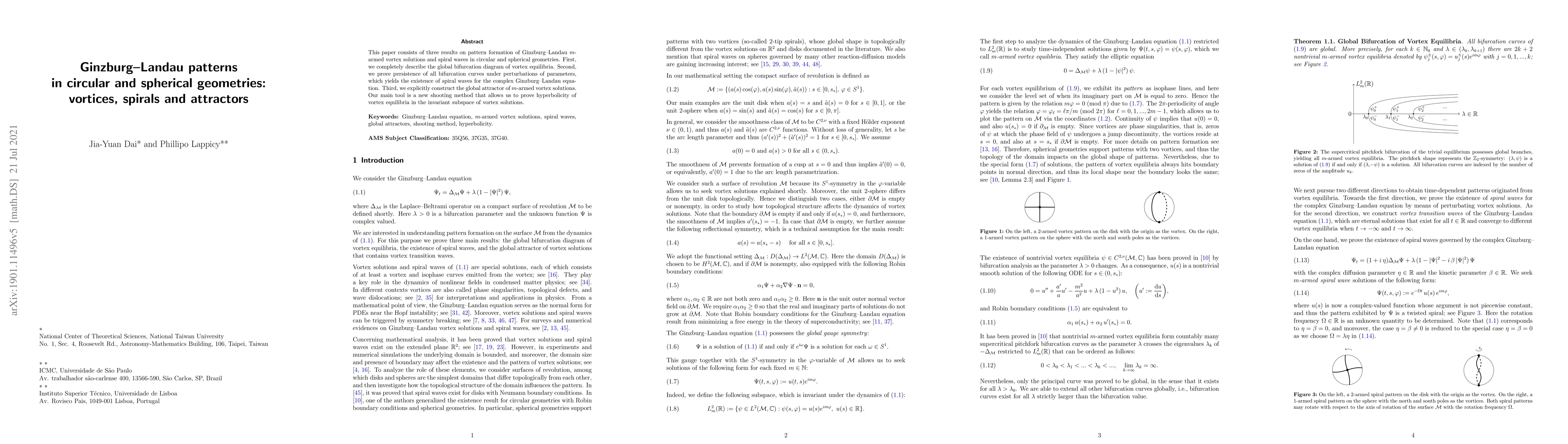 This paper explores the pattern formation of Ginzburg-Landau $m$-armed vortex solutions and spiral waves in circular and spherical geometries, detailing the global bifurcation diagram, proving the persistence of bifurcation curves, and constructing the global attractor for vortex solutions using a novel shooting method.