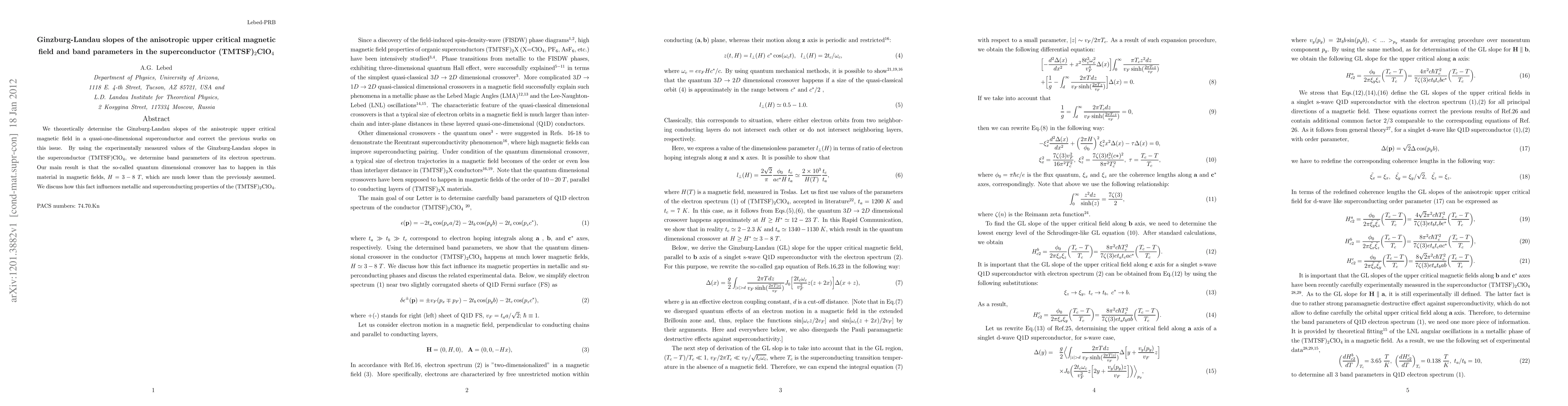 We theoretically determine the Ginzburg-Landau slopes of the anisotropic upper critical magnetic field in a quasi-one-dimensional superconductor and correct the previous works on this issue. By using the experimentally measured values of the Ginzburg-Landau slopes in the superconductor (TMTSF)$_2$ClO$_4$, we determine band parameters of its electron spectrum. Our main result is that the so-called quantum dimensional crossover has to happen in this material in magnetic fields, $H = 3-8 \ T$, which are much lower than the previously assumed. We discuss how this fact influences metallic and superconducting properties of the (TMTSF)$_2$ClO$_4$.