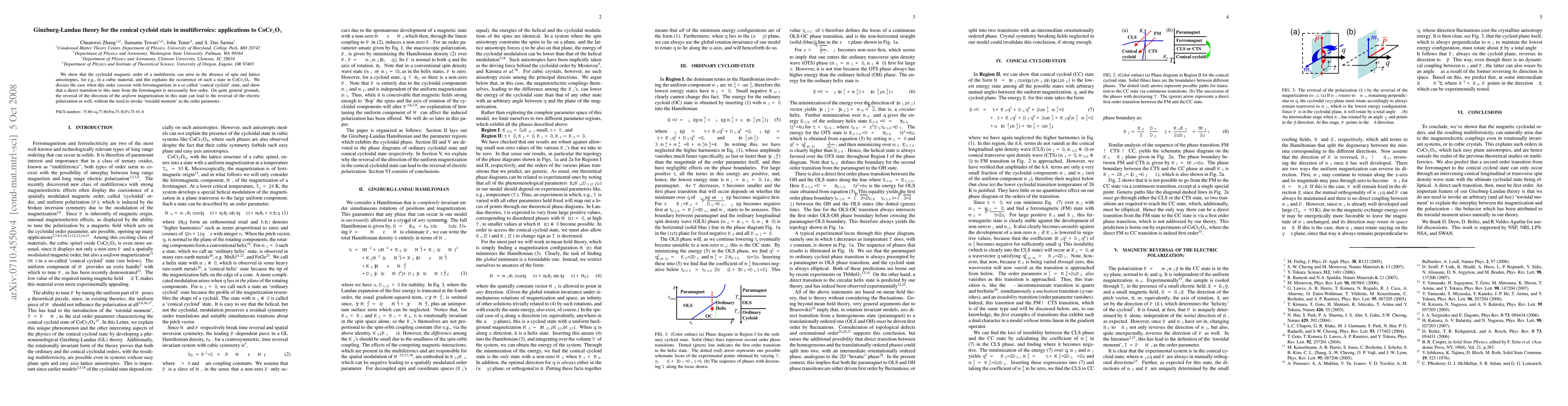 We show that the cycloidal magnetic order of a multiferroic can arise in the absence of spin and lattice anisotropies, for e.g., in a cubic material, and this explains the occurrence of such a state in CoCr$_2$O$_4$. We discuss the case when this order coexists with ferromagnetism in a so called `conical cycloid' state, and show that a direct transition to this state from the ferromagnet is necessarily first order. On quite general grounds, the reversal of the direction of the uniform magnetization in this state can lead to the reversal of the electric polarization as well, without the need to invoke `toroidal moment' as the order parameter.