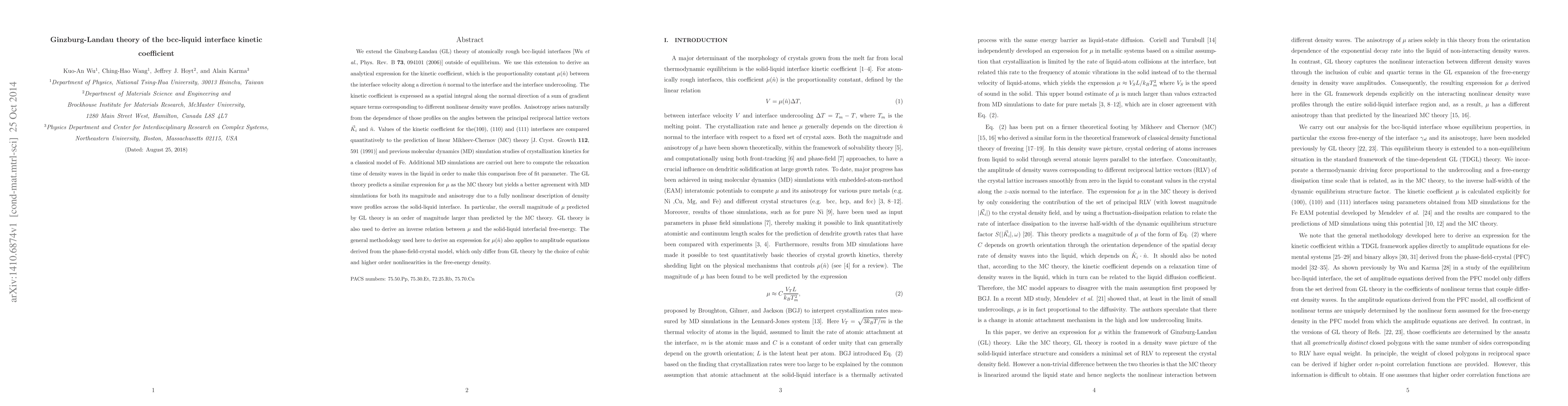 We extend the Ginzburg-Landau (GL) theory of atomically rough bcc-liquid interfaces [Wu {\it et al.}, Phys. Rev. B \textbf{73}, 094101 (2006)] outside of equilibrium. We use this extension to derive an analytical expression for the kinetic coefficient, which is the proportionality constant $\mu(\hat n)$ between the interface velocity along a direction $\hat n$ normal to the interface and the interface undercooling. The kinetic coefficient is expressed as a spatial integral along the normal direction of a sum of gradient square terms corresponding to different nonlinear density wave profiles. Anisotropy arises naturally from the dependence of those profiles on the angles between the principal reciprocal lattice vectors $\vec K_i$ and $\hat n$. Values of the kinetic coefficient for the$(100)$, $(110)$ and $(111)$ interfaces are compared quantitatively to the prediction of linear Mikheev-Chernov (MC) theory [J. Cryst. Growth \textbf{112}, 591 (1991)] and previous molecular dynamics (MD) simulation studies of crystallization kinetics for a classical model of Fe. Additional MD simulations are carried out here to compute the relaxation time of density waves in the liquid in order to make this comparison free of fit parameter. The GL theory predicts a similar expression for $\mu$ as the MC theory but yields a better agreement with MD simulations for both its magnitude and anisotropy due to a fully nonlinear description of density wave profiles across the solid-liquid interface. GL theory is also used to derive an inverse relation between $\mu$ and the solid-liquid interfacial free-energy. The general methodology used here to derive an expression for $\mu(\hat n)$ also applies to amplitude equations derived from the phase-field-crystal model, which only differ from GL theory by the choice of cubic and higher order nonlinearities in the free-energy density.