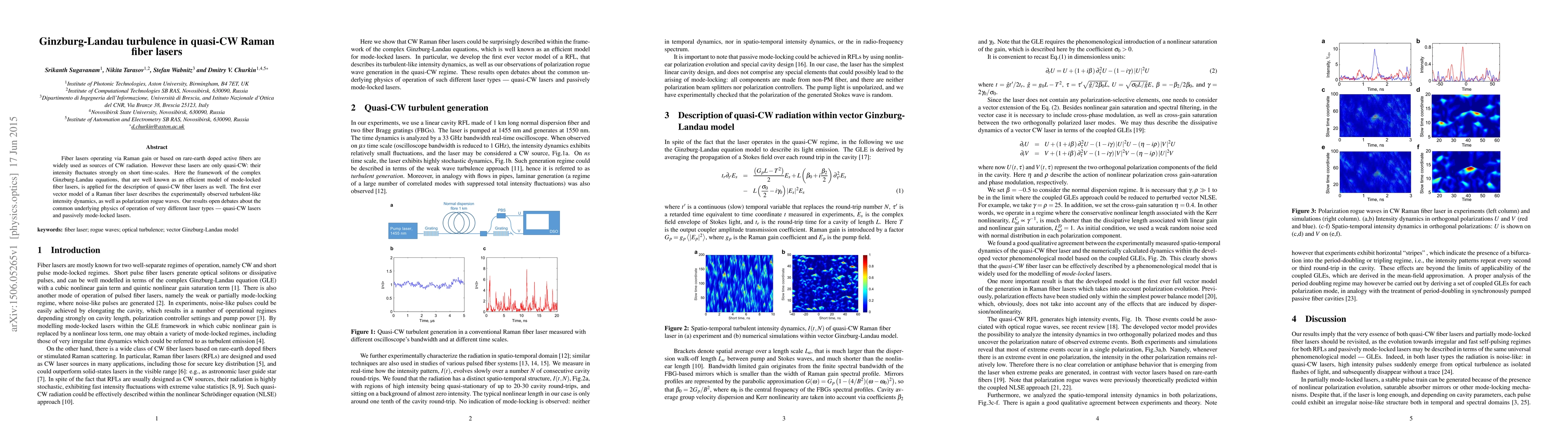 Fiber lasers operating via Raman gain or based on rare-earth doped active fibers are widely used as sources of CW radiation. However these lasers are only quasi-CW: their intensity fluctuates strongly on short time-scales. Here the framework of the complex Ginzburg-Landau equations, that are well known as an efficient model of mode-locked fiber lasers, is applied for the description of quasi-CW fiber lasers as well. The first ever vector model of a Raman fiber laser describes the experimentally observed turbulent-like intensity dynamics, as well as polarization rogue waves. Our results open debates about the common underlying physics of operation of very different laser types - quasi-CW lasers and passively mode-locked lasers.