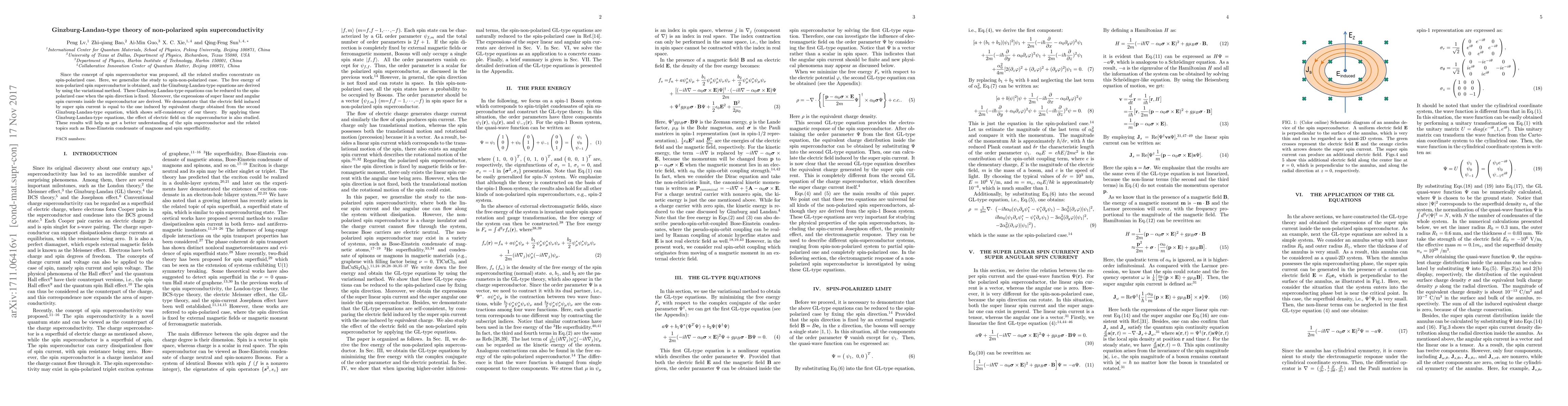 Since the concept of spin superconductor was proposed, all the related studies concentrate on spin-polarized case. Here, we generalize the study to spin-non-polarized case. The free energy of non-polarized spin superconductor is obtained, and the Ginzburg-Landau-type equations are derived by using the variational method. These Ginzburg-Landau-type equations can be reduced to the spin-polarized case when the spin direction is fixed. Moreover, the expressions of super linear and angular spin currents inside the superconductor are derived. We demonstrate that the electric field induced by super spin current is equal to the one induced by equivalent charge obtained from the second Ginzburg-Landau-type equation, which shows self-consistency of our theory. By applying these Ginzburg-Landau-type equations, the effect of electric field on the superconductor is also studied. These results will help us get a better understanding of the spin superconductor and the related topics such as Bose-Einstein condensate of magnons and spin superfluidity.