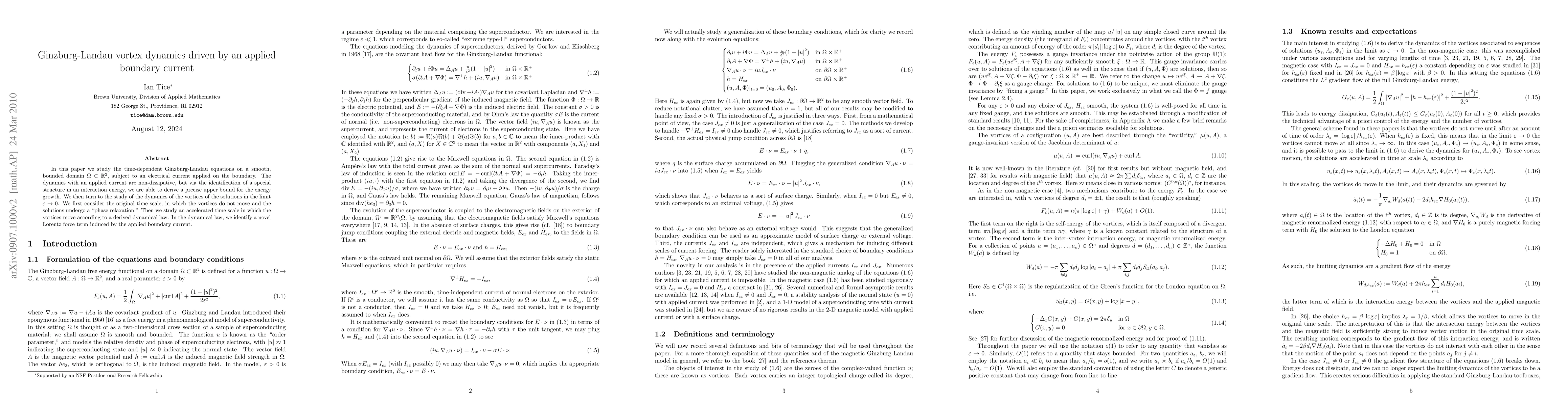 In this paper we study the time-dependent Ginzburg-Landau equations on a smooth, bounded domain $\Omega \subset \Rn{2}$, subject to an electrical current applied on the boundary. The dynamics with an applied current are non-dissipative, but via the identification of a special structure in an interaction energy, we are able to derive a precise upper bound for the energy growth. We then turn to the study of the dynamics of the vortices of the solutions in the limit $\ep \to 0$. We first consider the original time scale, in which the vortices do not move and the solutions undergo a "phase relaxation." Then we study an accelerated time scale in which the vortices move according to a derived dynamical law. In the dynamical law, we identify a novel Lorentz force term induced by the applied boundary current.