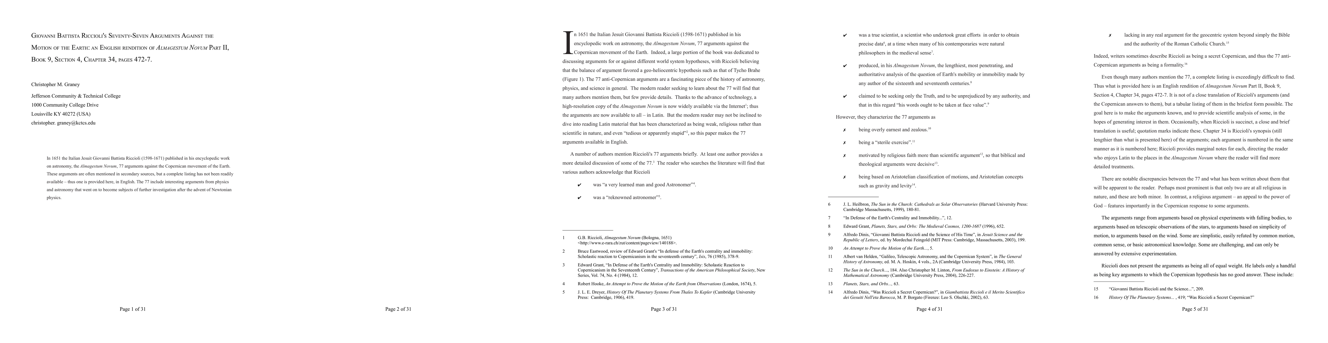 Giovanni Battista Riccioli's 1651 Almagestum Novum presents 77 arguments against the Earth's motion, offering a comprehensive list of these often-cited arguments in English for the first time. These arguments, rooted in physics and astronomy, spurred further investigation following the development of Newtonian physics.