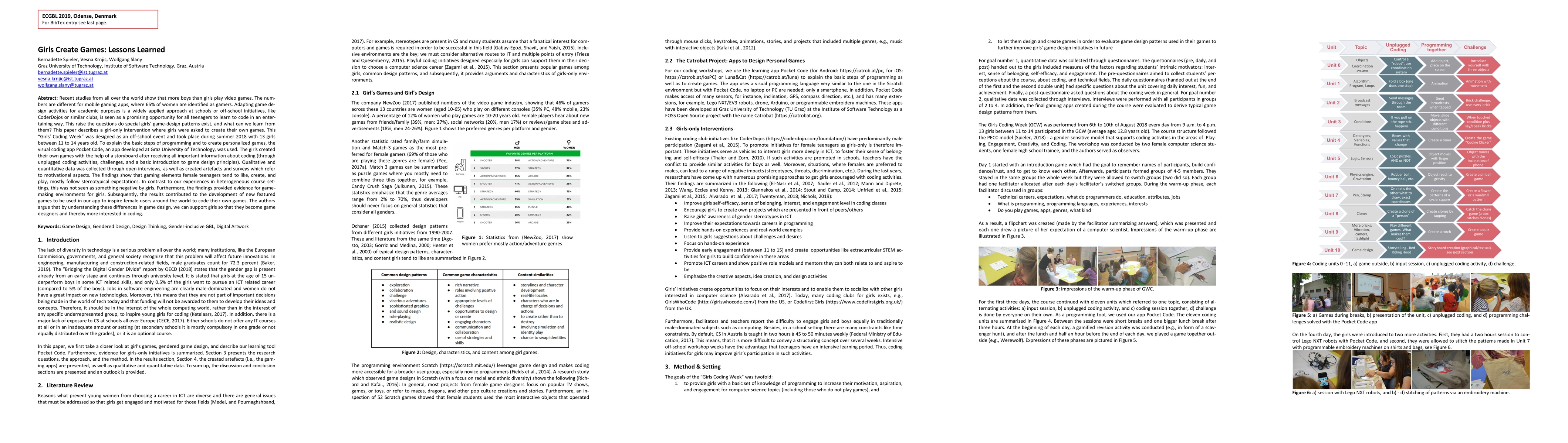 Recent studies from all over the world show that more boys than girls play video games. The numbers are different for mobile gaming apps, where 65% of women are identified as gamers. Adapting game design activities for academic purposes is a widely applied approach at schools or off-school initiatives is seen as a promising opportunity for all teenagers to learn to code in an entertaining way. This raise the questions do special girls' game-design patterns exist, and what can we learn from them? This paper describes a girl-only intervention where girls were asked to create their own games. This "Girls' Coding Week" was designed as an off-school event and took place during summer 2018 with 13 girls between 11 to 14 years old. To explain the basic steps of programming and to create personalized games, the visual coding app Pocket Code, an app developed at Graz University of Technology, was used. The girls created their own games with the help of a storyboard after receiving all important information about coding. Qualitative and quantitative data was collected through open interviews, as well as created artefacts and surveys which refer to motivational aspects. The findings show that gaming elements female teenagers tend to like, create, and play, mostly follow stereotypical expectations. In contrast to our experiences in heterogeneous course settings, this was not seen as something negative by girls. Furthermore, the findings provided evidence for game-making environments for girls. Subsequently, the results contributed to the development of new featured games to be used in our app to inspire female users around the world to code their own games. The authors argue that by understanding these differences in game design, we can support girls so that they become game designers and thereby more interested in coding.