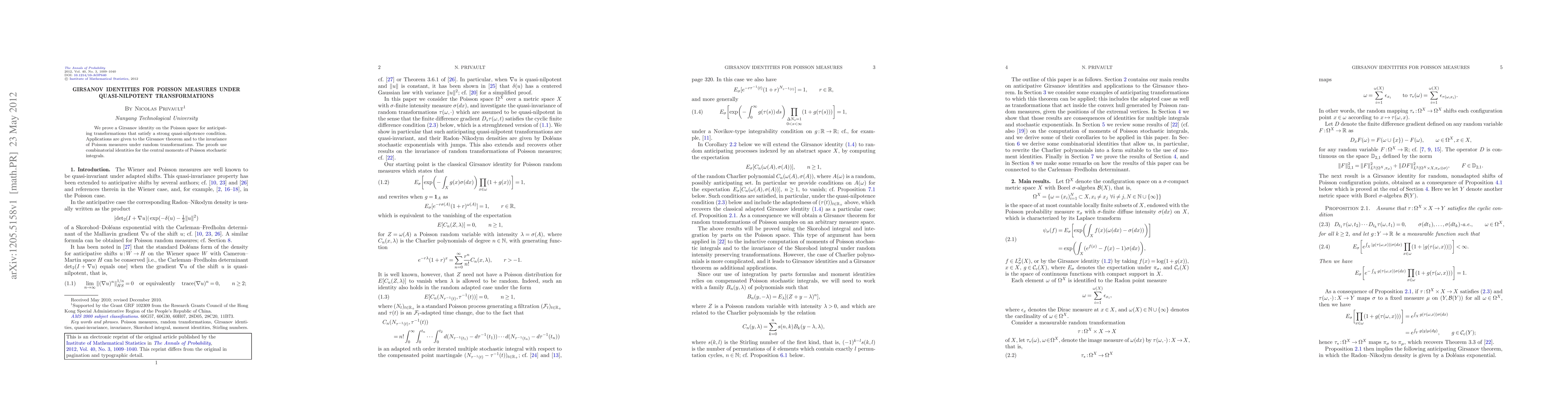 Summary: This paper establishes a Girsanov identity for Poisson measures under quasi-nilpotent transformations, utilizing combinatorial identities for central moments of Poisson stochastic integrals. It also explores applications to the Girsanov theorem and the invariance of Poisson measures under random transformations.