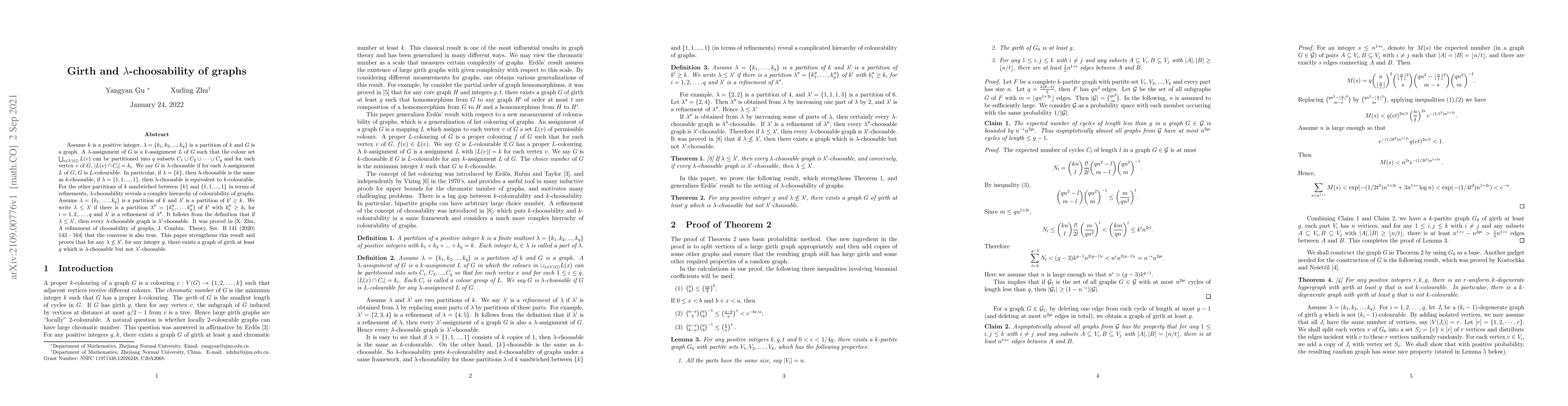 Assume $ k $ is a positive integer, $ \lambda=\{k_1,k_2,...,k_q\} $ is a partition of $ k $ and $ G $ is a graph. A $\lambda$-assignment of $ G $ is a $ k $-assignment $ L $ of $ G $ such that the colour set $ \bigcup_{v\in V(G)} L(v) $ can be partitioned into $ q $ subsets $ C_1\cup C_2\cup\cdots\cup C_q $ and for each vertex $ v $ of $ G $, $ |L(v)\cap C_i|=k_i $. We say $ G $ is $\lambda$-choosable if for each $\lambda$-assignment $ L $ of $ G $, $ G $ is $ L $-colourable. In particular, if $ \lambda=\{k\} $, then $\lambda$-choosable is the same as $ k $-choosable, if $ \lambda=\{1, 1,...,1\} $, then $\lambda$-choosable is equivalent to $ k $-colourable. For the other partitions of $ k $ sandwiched between $ \{k\} $ and $ \{1, 1,...,1\} $ in terms of refinements, $\lambda$-choosability reveals a complex hierarchy of colourability of graphs. Assume $\lambda=\{k_1, \ldots, k_q\} $ is a partition of $ k $ and $\lambda' $ is a partition of $ k'\ge k $. We write $ \lambda\le \lambda' $ if there is a partition $\lambda''=\{k''_1, \ldots, k''_q\}$ of $k'$ with $k''_i \ge k_i$ for $i=1,2,\ldots, q$ and $\lambda'$ is a refinement of $\lambda''$. It follows from the definition that if $ \lambda\le \lambda' $, then every $\lambda$-choosable graph is $\lambda'$-choosable. It was proved in [X. Zhu, A refinement of choosability of graphs, J. Combin. Theory, Ser. B 141 (2020) 143 - 164] that the converse is also true. This paper strengthens this result and proves that for any $ \lambda\not\le \lambda' $, for any integer $g$, there exists a graph of girth at least $g$ which is $\lambda$-choosable but not $\lambda'$-choosable.