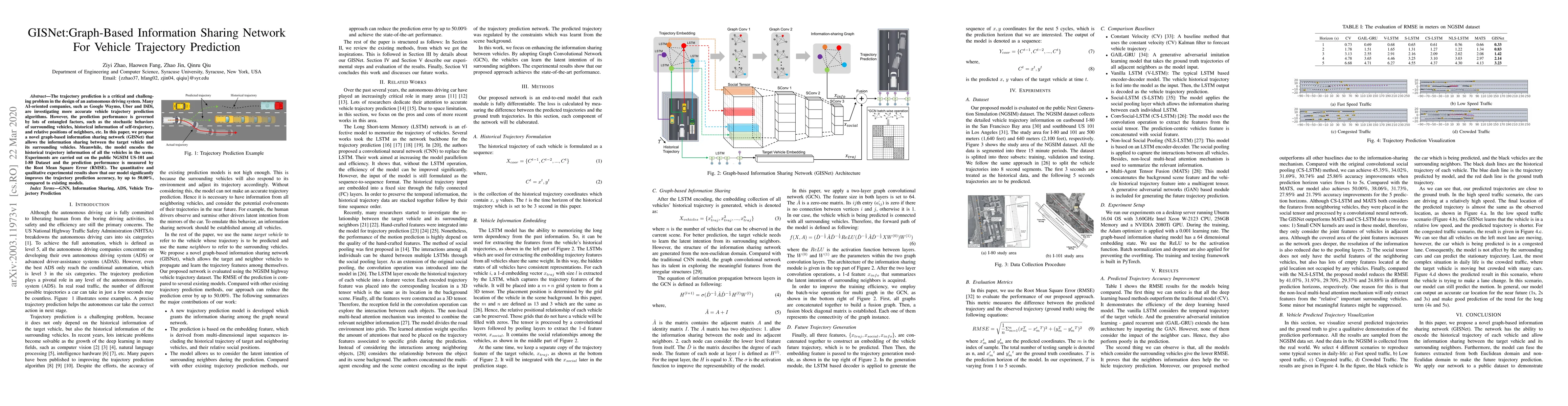 The paper proposes GISNet, a graph-based information sharing network for vehicle trajectory prediction in autonomous driving systems. The model enhances prediction accuracy by sharing information between vehicles and encoding historical trajectory data, achieving up to a 50% improvement over existing methods.