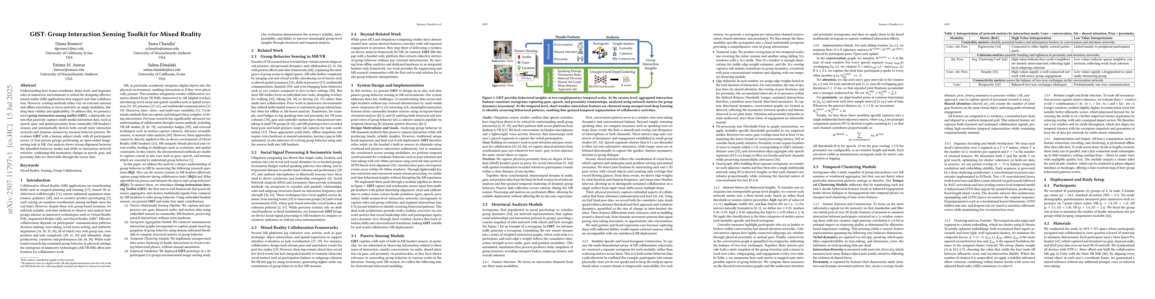 Understanding how teams coordinate, share work, and negotiate roles in immersive environments is critical for designing effective mixed-reality (MR) applications that support real-time collaboration. However, existing methods either rely on external cameras and offline annotation or focus narrowly on single modalities, limiting their validity and applicability. To address this, we present a novel group interaction sensing toolkit (GIST), a deployable system that passively captures multi-modal interaction data, such as speech, gaze, and spatial proximity from commodity MR headset's sensors and automatically derives both overall static interaction networks and dynamic moment-by-moment behavior patterns. We evaluate GIST with a human subject study with 48 participants across 12 four-person groups performing an open-ended image-sorting task in MR. Our analysis shows strong alignment between the identified behavior modes and shifts in interaction network structure, confirming that momentary changes in speech, gaze, and proximity data are observable through the sensor data.