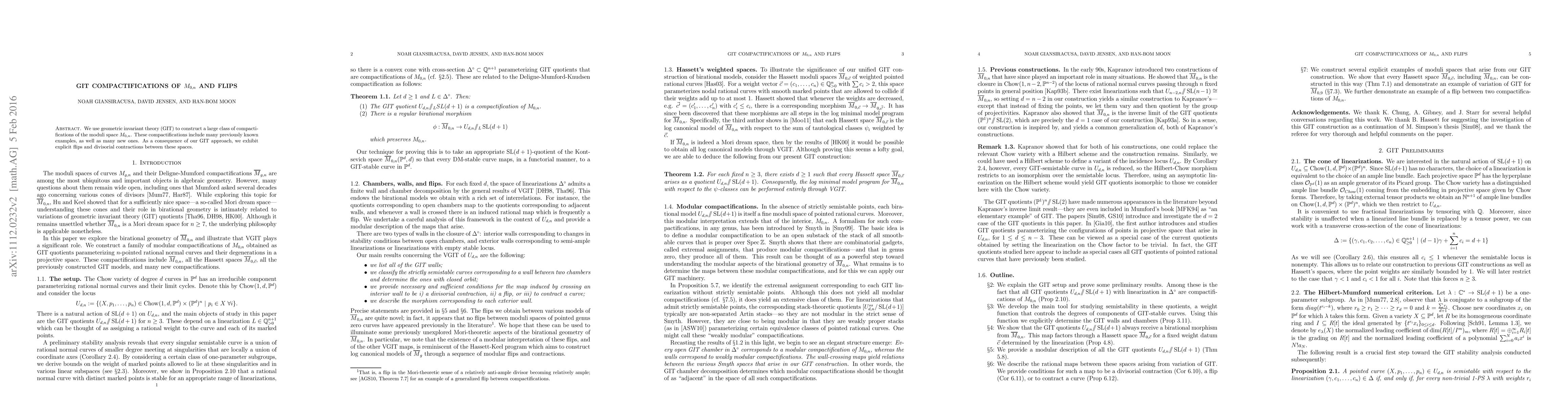 This paper utilizes geometric invariant theory (GIT) to create a wide array of compactifications of the moduli space M_{0,n}, encompassing both existing and novel examples. The GIT methodology reveals explicit flips and divisorial contractions among these newly constructed spaces.