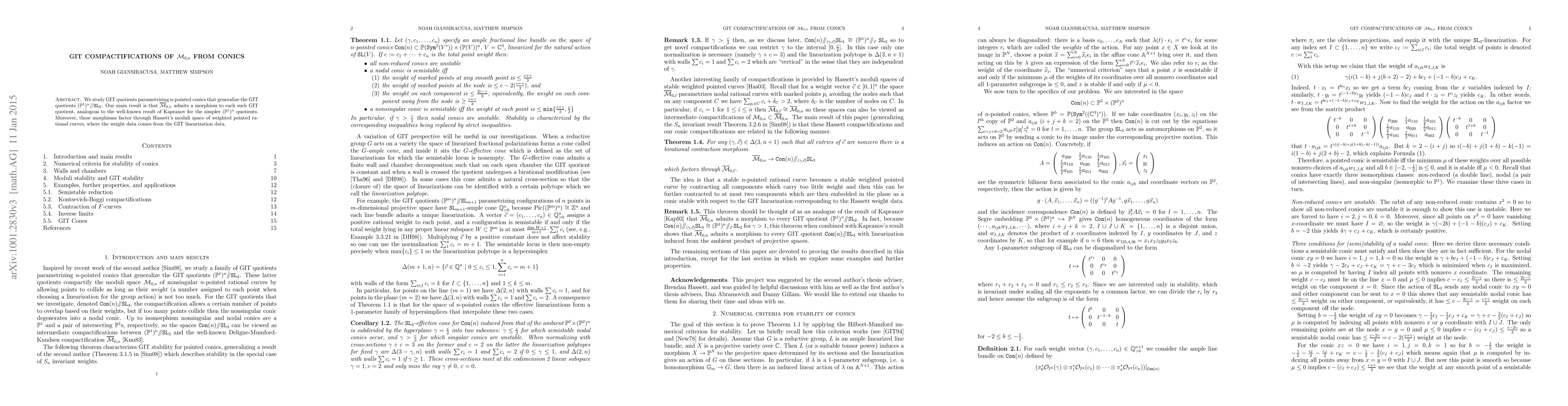 This paper explores GIT compactifications of $M_{0,n}$ through n-pointed conics, generalizing $(\mathbb{P}^1)^n//SL_2$ GIT quotients. The main finding is that $\overline{M}_{0,n}$ maps to these conic GIT quotients, similar to Kapranov's result, with these mappings passing through Hassett's weighted rational curve moduli spaces.