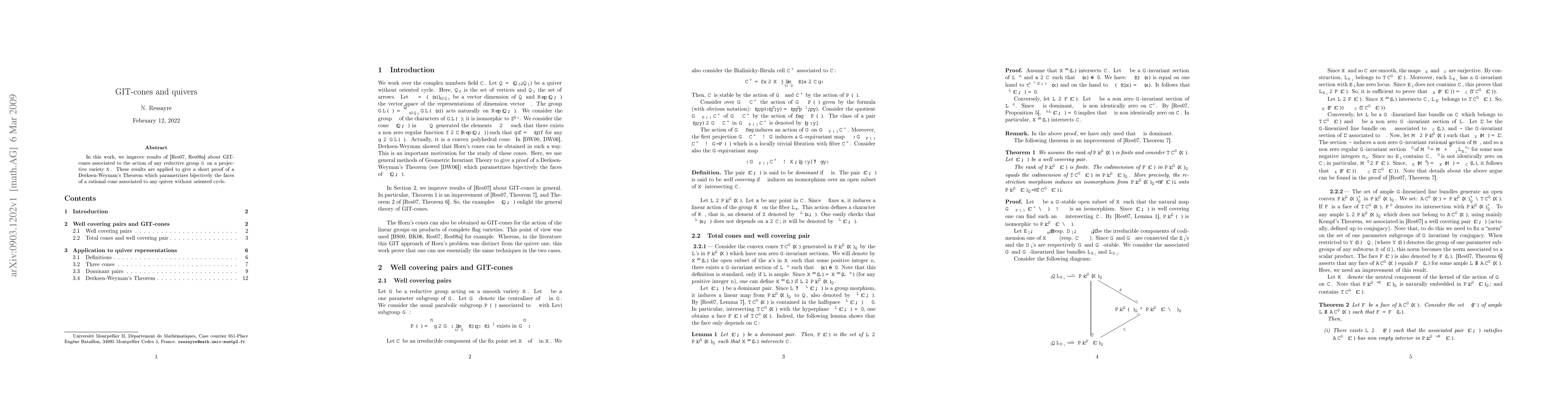 In this work, we improve results about GIT-cones associated to the action of any reductive group $G$ on a projective variety $X$. These results are applied to give a short proof of a Derksen-Weyman's Theorem which parametrizes bijectively the faces of a rational cone associated to any quiver without oriented cycle.