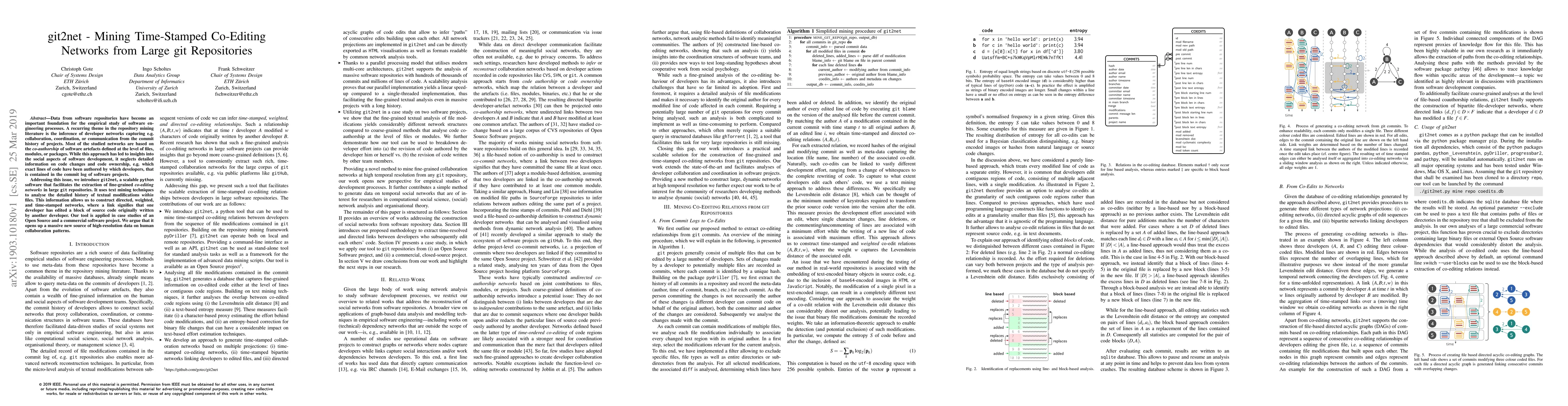 git2net is a scalable Python tool for extracting fine-grained co-editing networks from large git repositories, using text mining to analyze detailed code modification history. It constructs directed, weighted, and time-stamped networks reflecting developer interactions on specific code blocks, offering high-resolution data on collaboration patterns.