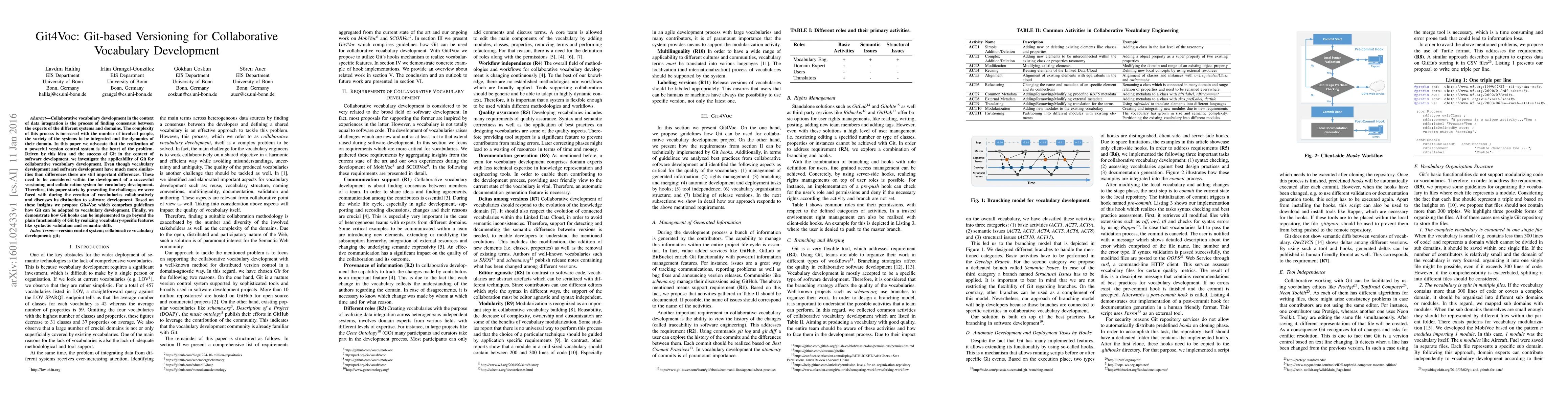 This paper explores adapting Git for collaborative vocabulary development, highlighting the unique challenges compared to software development. It proposes Git4Voc, a Git-based versioning system tailored for vocabulary projects, incorporating Git hooks for vocabulary-specific features like syntactic validation and semantic diffs.