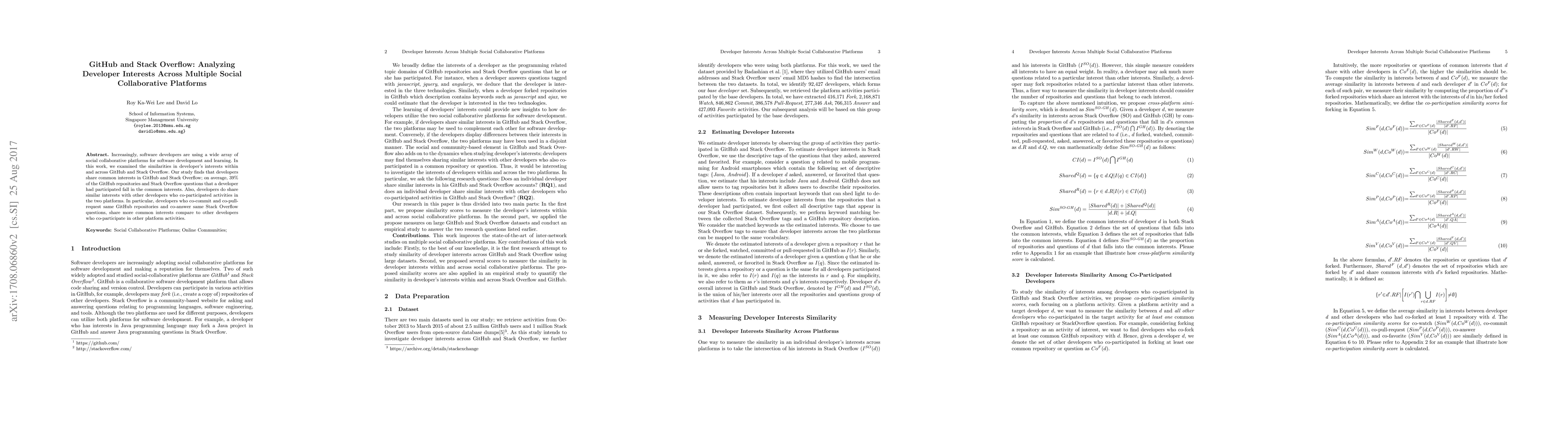 Increasingly, software developers are using a wide array of social collaborative platforms for software development and learning. In this work, we examined the similarities in developer's interests within and across GitHub and Stack Overflow. Our study finds that developers share common interests in GitHub and Stack Overflow, on average, 39% of the GitHub repositories and Stack Overflow questions that a developer had participated fall in the common interests. Also, developers do share similar interests with other developers who co-participated activities in the two platforms. In particular, developers who co-commit and co-pull-request same GitHub repositories and co-answer same Stack Overflow questions, share more common interests compare to other developers who co-participate in other platform activities.