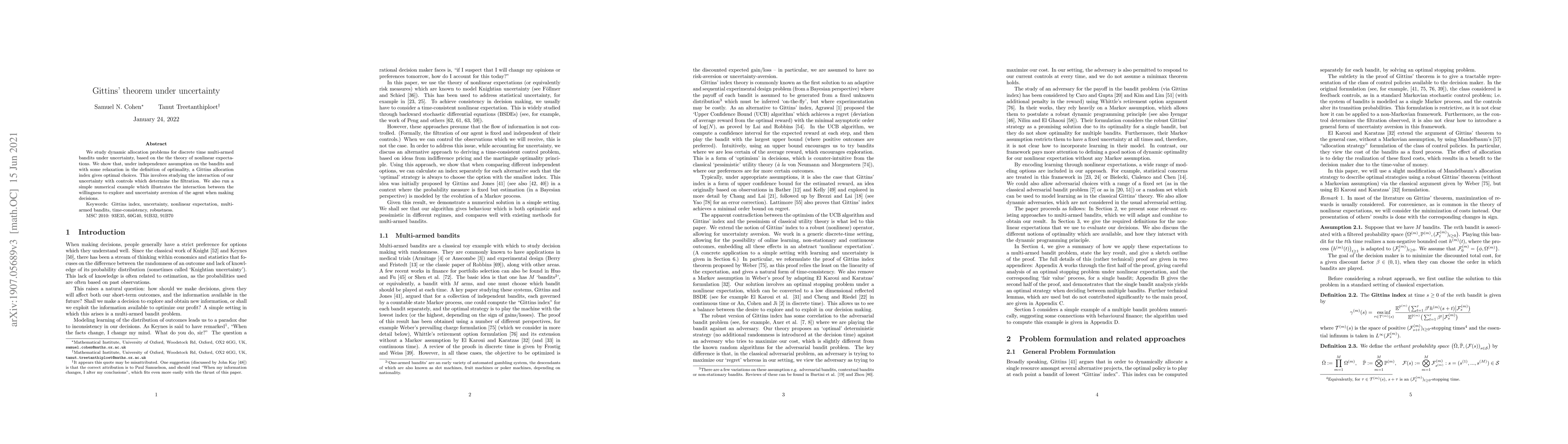 Researchers show that Gittins' allocation index can provide optimal choices in dynamic multi-armed bandits under uncertainty, even with relaxed optimality conditions. They also illustrate the impact of uncertainty aversion on decision-making in a numerical example.