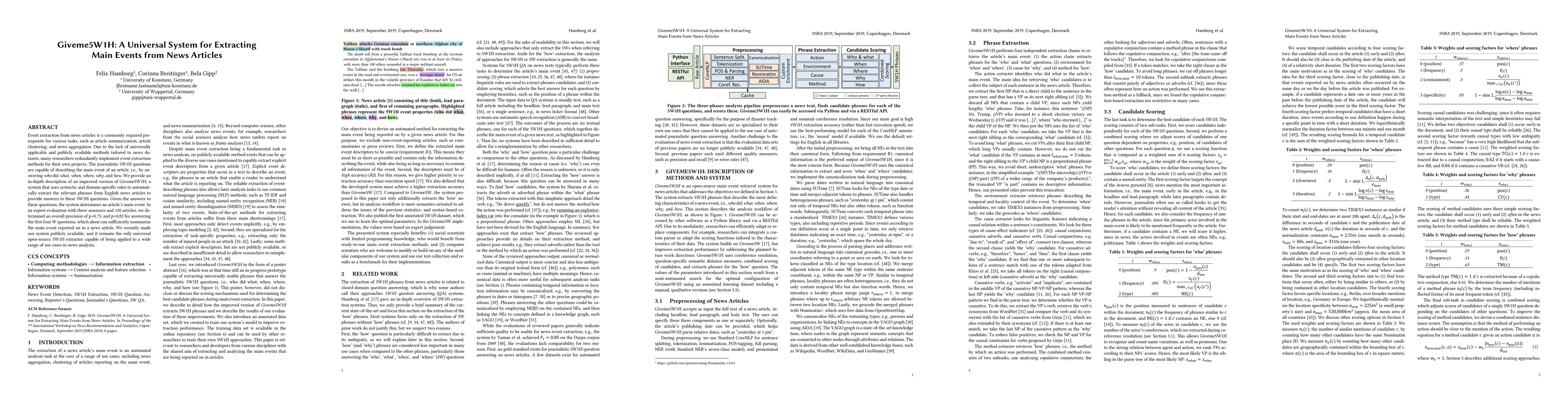 The Giveme5W1H system extracts main events from news articles by answering the 5W1H questions (who, what, when, where, why, how) using syntactic and domain-specific rules. It achieved an overall precision of 0.73 in expert evaluations, making it a publicly available universal open-source tool for news analysis.