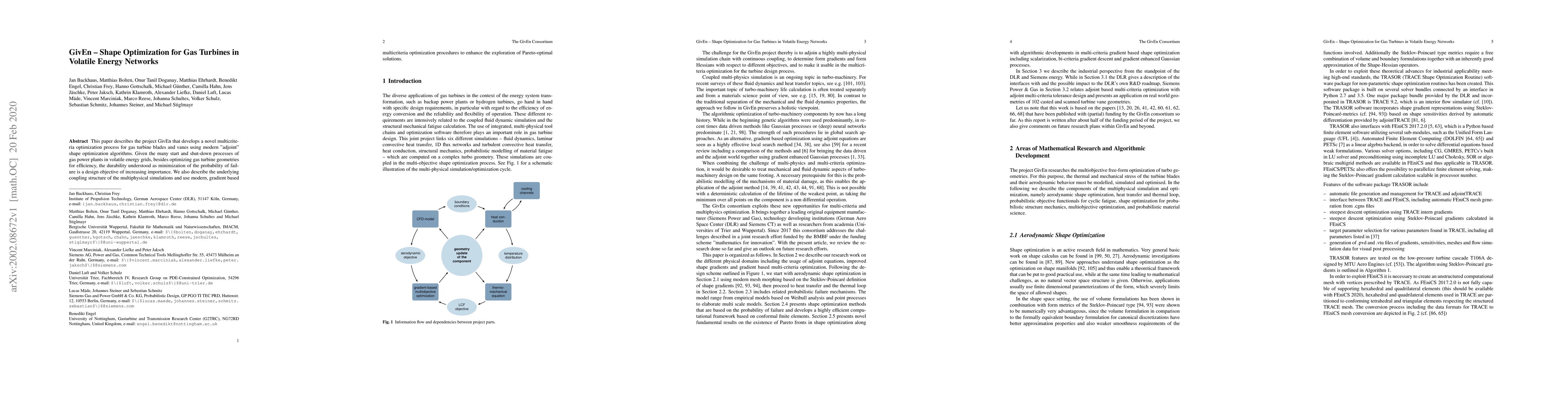 This paper describes the project GivEn that develops a novel multicriteria optimization process for gas turbine blades and vanes using modern "adjoint" shape optimization algorithms. Given the many start and shut-down processes of gas power plants in volatile energy grids, besides optimizing gas turbine geometries for efficiency, the durability understood as minimization of the probability of failure is a design objective of increasing importance. We also describe the underlying coupling structure of the multiphysical simulations and use modern, gradient based multicriteria optimization procedures to enhance the exploration of Pareto-optimal solutions.