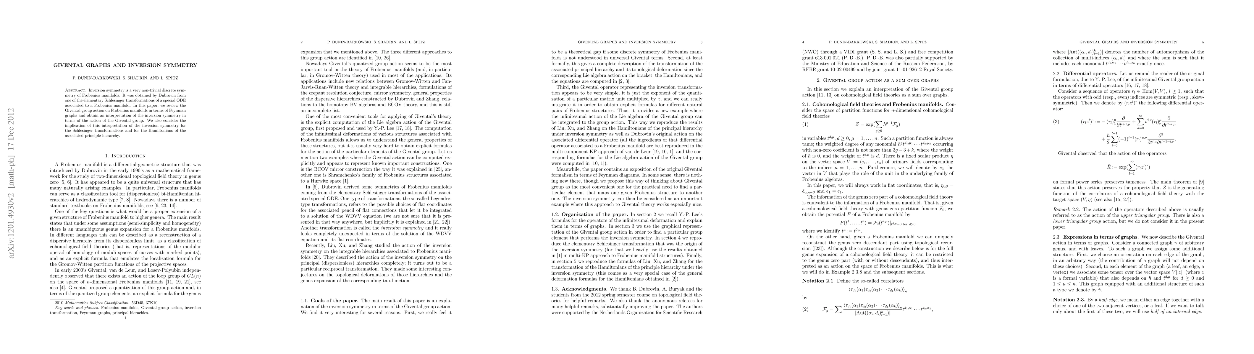 The paper reviews the Givental group action on Frobenius manifolds in terms of Feynman graphs, interpreting inversion symmetry through this group action.