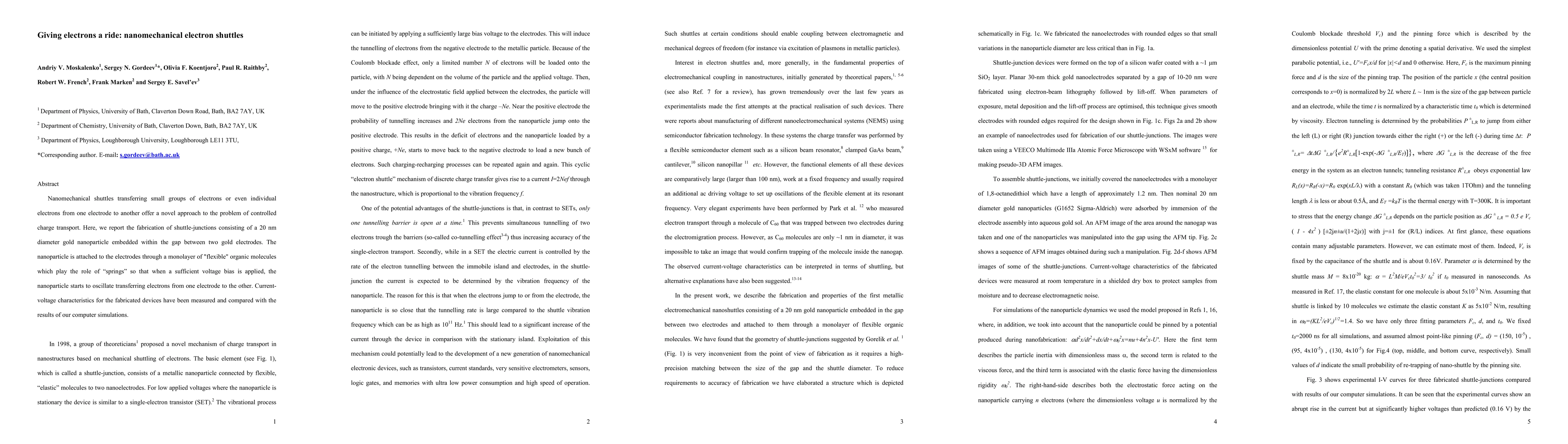 This paper reports the fabrication of nanomechanical electron shuttles using a 20 nm gold nanoparticle embedded between two gold electrodes, with organic molecules acting as springs. The shuttles can transfer electrons under sufficient voltage bias, and their current-voltage characteristics are measured and compared with simulations.