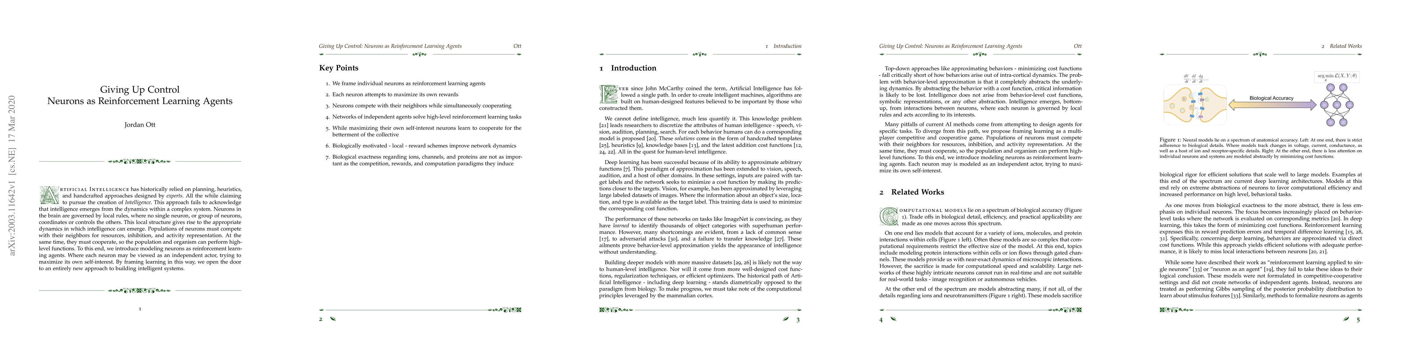 Artificial Intelligence has historically relied on planning, heuristics, and handcrafted approaches designed by experts. All the while claiming to pursue the creation of Intelligence. This approach fails to acknowledge that intelligence emerges from the dynamics within a complex system. Neurons in the brain are governed by local rules, where no single neuron, or group of neurons, coordinates or controls the others. This local structure gives rise to the appropriate dynamics in which intelligence can emerge. Populations of neurons must compete with their neighbors for resources, inhibition, and activity representation. At the same time, they must cooperate, so the population and organism can perform high-level functions. To this end, we introduce modeling neurons as reinforcement learning agents. Where each neuron may be viewed as an independent actor, trying to maximize its own self-interest. By framing learning in this way, we open the door to an entirely new approach to building intelligent systems.