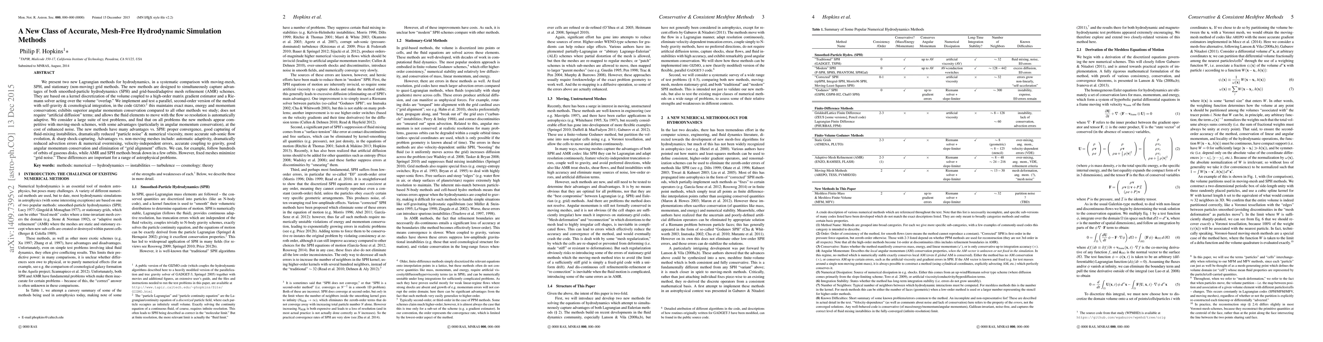 We present two new Lagrangian methods for hydrodynamics, in a systematic comparison with moving-mesh, SPH, and stationary (non-moving) grid methods. The new methods are designed to simultaneously capture advantages of both smoothed-particle hydrodynamics (SPH) and grid-based/adaptive mesh refinement (AMR) schemes. They are based on a kernel discretization of the volume coupled to a high-order matrix gradient estimator and a Riemann solver acting over the volume 'overlap.' We implement and test a parallel, second-order version of the method with self-gravity & cosmological integration, in the code GIZMO: this maintains exact mass, energy and momentum conservation; exhibits superior angular momentum conservation compared to all other methods we study; does not require 'artificial diffusion' terms; and allows the fluid elements to move with the flow so resolution is automatically adaptive. We consider a large suite of test problems, and find that on all problems the new methods appear competitive with moving-mesh schemes, with some advantages (particularly in angular momentum conservation), at the cost of enhanced noise. The new methods have many advantages vs. SPH: proper convergence, good capturing of fluid-mixing instabilities, dramatically reduced 'particle noise' & numerical viscosity, more accurate sub-sonic flow evolution, & sharp shock-capturing. Advantages vs. non-moving meshes include: automatic adaptivity, dramatically reduced advection errors & numerical overmixing, velocity-independent errors, accurate coupling to gravity, good angular momentum conservation and elimination of 'grid alignment' effects. We can, for example, follow hundreds of orbits of gaseous disks, while AMR and SPH methods break down in a few orbits. However, fixed meshes minimize 'grid noise.' These differences are important for a range of astrophysical problems.