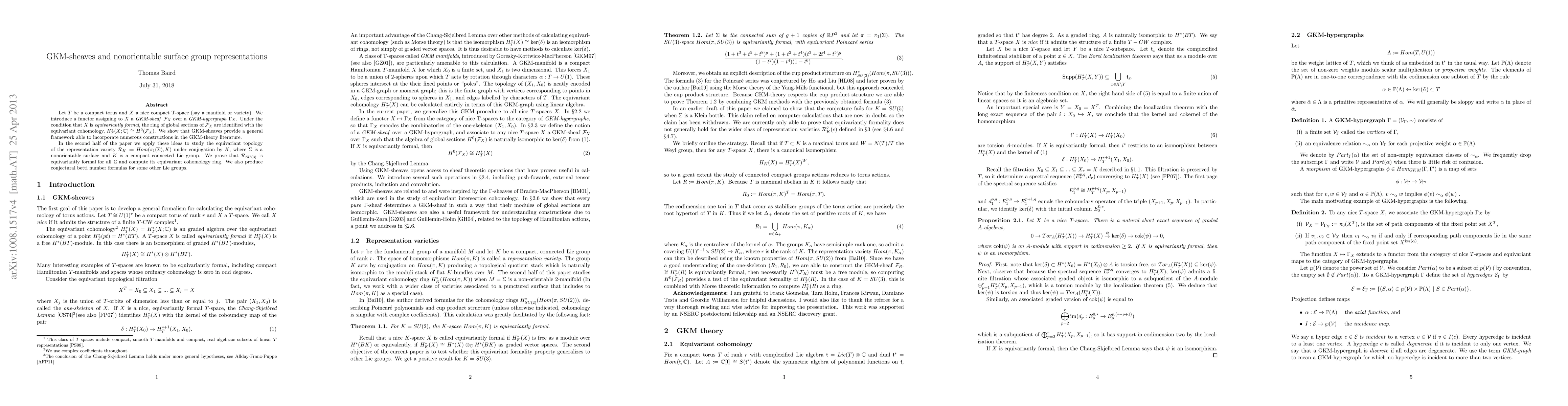 Let T be a compact torus and X a nice compact T-space (say a manifold or variety). We introduce a functor assigning to X a "GKM-sheaf" F_X over a "GKM-hypergraph" G_X. Under the condition that X is equivariantly formal, the ring of global sections of F_X are identified with the equivariant cohomology, H_T^*(X; C). We show that GKM-sheaves provide a general framework able to incorporate numerous constructions in the GKM-theory literature. In the second half of the paper we apply these ideas to study the equivariant topology of the representation variety R_K := Hom(\pi_1(S), K) under conjugation by K, where S is a nonorientable surface and K is a compact connected Lie group. We prove that R_{SU(3)} is equivariantly formal for all S and compute its equivariant cohomology. . We also produce conjectural betti number formulas for some other Lie groups.