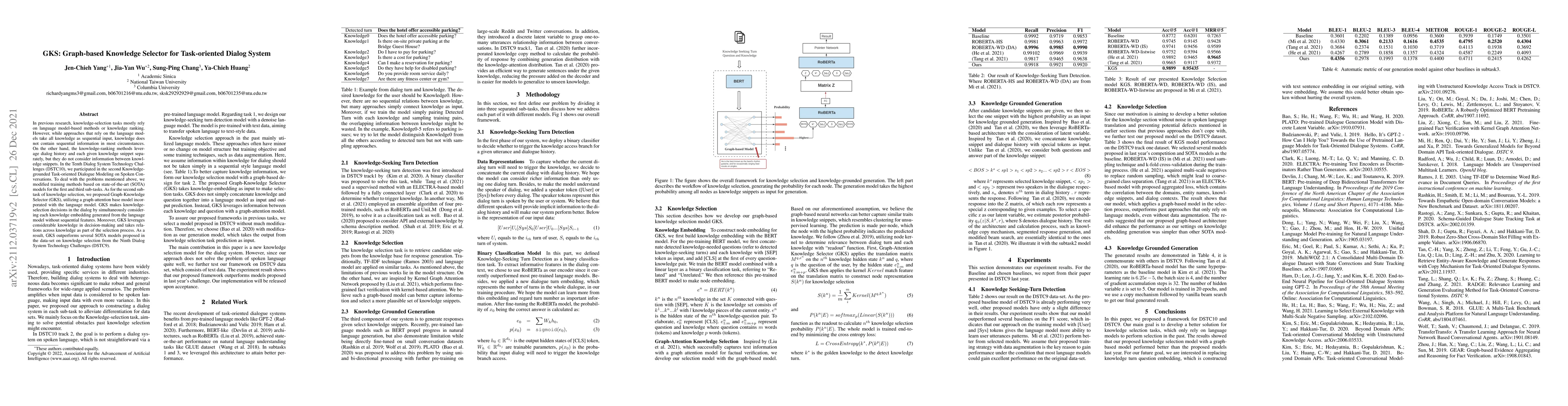 In previous research, knowledge-selection tasks mostly rely on language model-based methods or knowledge ranking. However, while approaches that rely on the language models take all knowledge as sequential input, knowledge does not contain sequential information in most circumstances. On the other hand, the knowledge-ranking methods leverage dialog history and each given knowledge snippet separately, but they do not consider information between knowledge snippets. In the Tenth Dialog System Technology Challenges (DSTC10), we participated in the second Knowledge-grounded Task-oriented Dialogue Modeling on Spoken Conversations. To deal with the problems mentioned above, we modified training methods based on state-of-the-art (SOTA) models for the first and third sub-tasks. As for the second sub-task of knowledge selection, we proposed Graph-Knowledge Selector (GKS), utilizing a graph-attention base model incorporated with the language model. GKS makes knowledge-selection decisions in the dialog by simultaneously considering each knowledge embedding generated from the language model without sequential features. Moreover, GKS leverages considerable knowledge in decision-making and takes relations across knowledge as part of the selection process. As a result, GKS outperforms several SOTA models proposed in the data-set on knowledge selection from the Ninth Dialog System Technology Challenges (DSTC9).