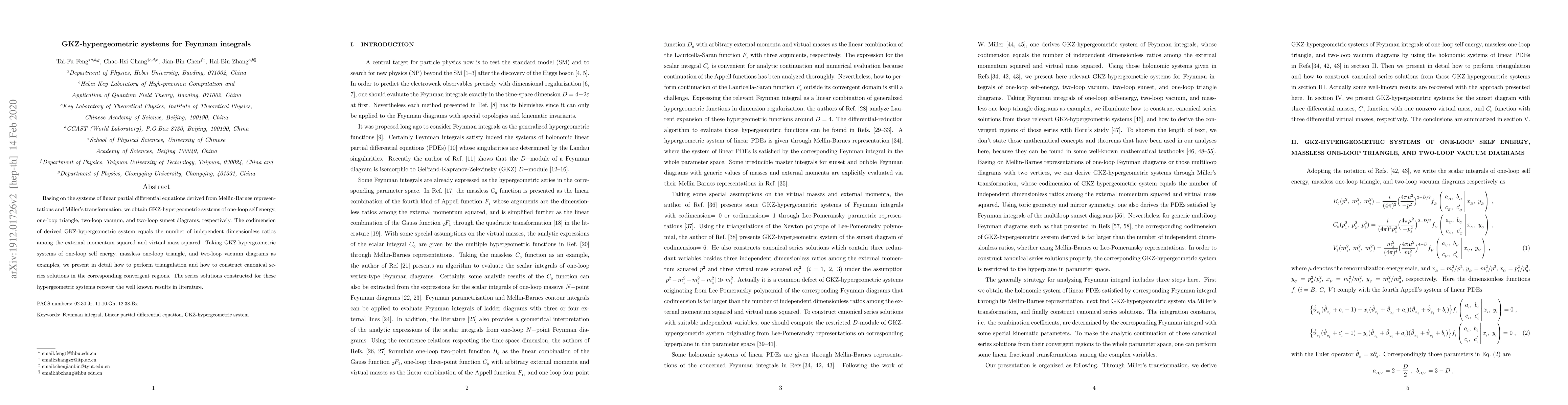 This paper derives GKZ-hypergeometric systems from Feynman integrals for one-loop and two-loop diagrams, demonstrating triangulation and construction of canonical series solutions that match known results. The complexity of these systems is linked to the number of independent momentum ratios.