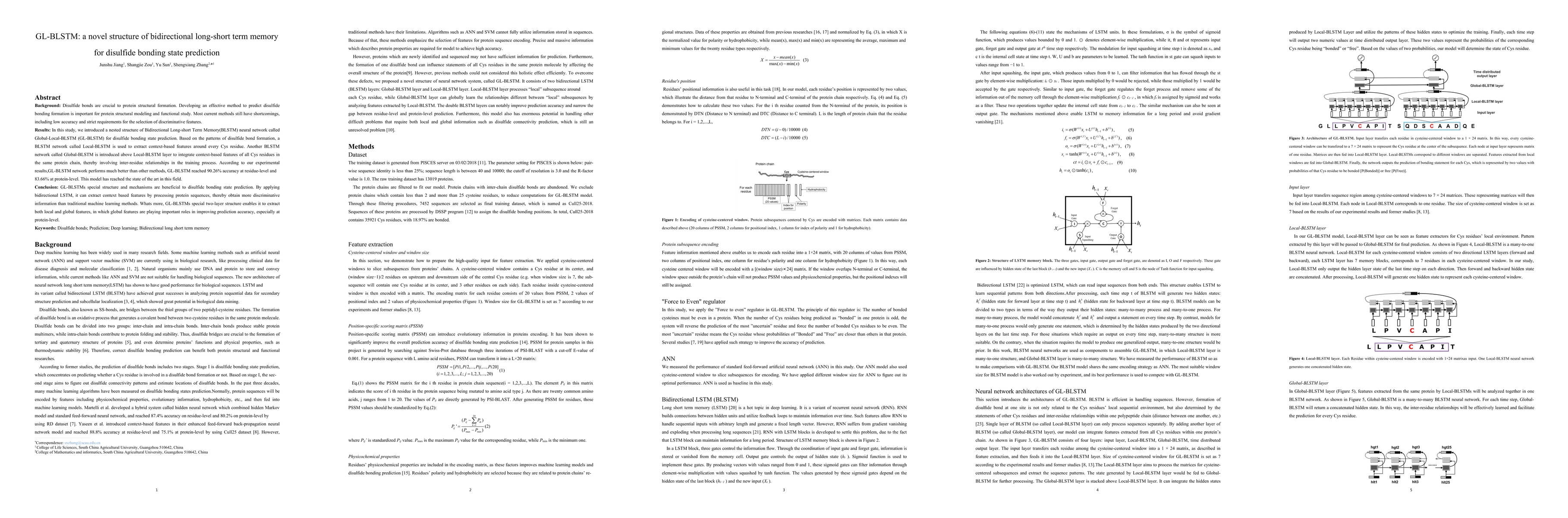 Background: Disulfide bonds are crucial to protein structural formation. Developing an effective method topredict disulfide bonding formation is important for protein structural modeling and functional study. Mostcurrent methods still have shortcomings, including low accuracy and strict requirements for the selection ofdiscriminative features. Results: In this study, we introduced a nested structure of Bidirectional Long-short Term Memory(BLSTM)neural network called Global-Local-BLSTM (GL-BLSTM) for disulfide bonding state prediction. Based on thepatterns of disulfide bond formation, a BLSTM network called Local-BLSTM is used to extract context-basedfeatures around every Cys residue. Another BLSTM network called Global-BLSTM is introduced aboveLocal-BLSTM layer to integrate context-based features of all Cys residues in the same protein chain, therebyinvolving inter-residue relationships in the training process. According to our experimental results,GL-BLSTMnetwork performs much better than other methods, GL-BLSTM reached 90.26% accuracy at residue-level and 83.66% at protein-level. This model has reached the state of the art in this field. Conclusion: GL-BLSTMs special structure and mechanisms are beneficial to disulfide bonding state prediction.By applying bidirectional LSTM, it can extract context based features by processing protein sequences, therebyobtain more discriminative information than traditional machine learning methods. Whats more, GL-BLSTMsspecial two-layer structure enables it to extract both local and global features, in which global features areplaying important roles in improving prediction accuracy, especially at protein-level. Keywords: Disulfide bonds; Prediction; Deep learning; Bidirectional long short term memory