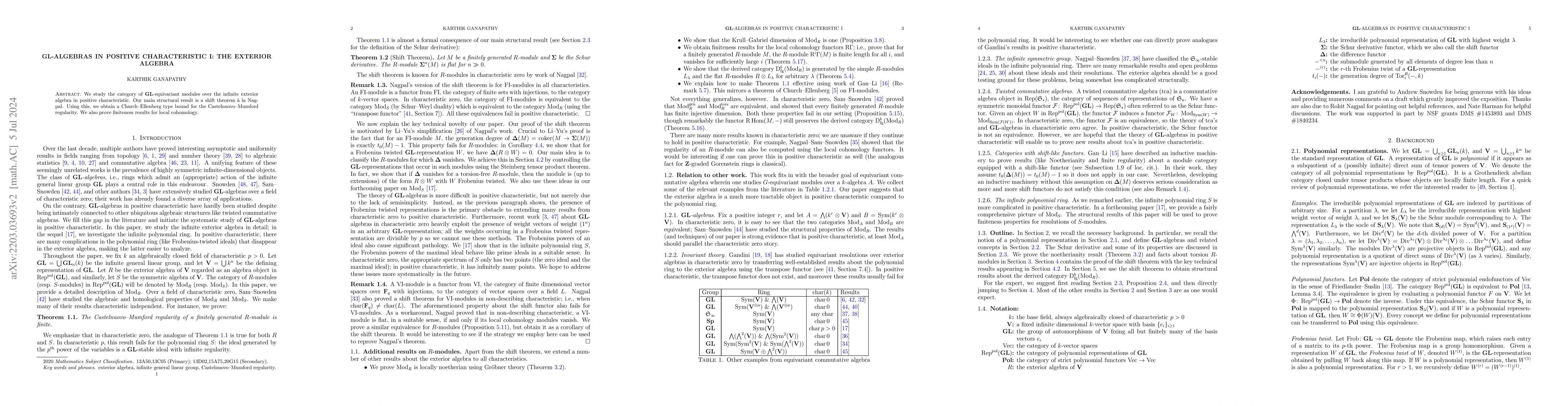 We study the category of GL-equivariant modules over the infinite exterior algebra in positive characteristic. Our main structural result is a shift theorem a la Nagpal. Using this, we obtain a Church--Ellenberg type bound for the Castelnuovo--Mumford regularity. We also prove finiteness results for local cohomology.