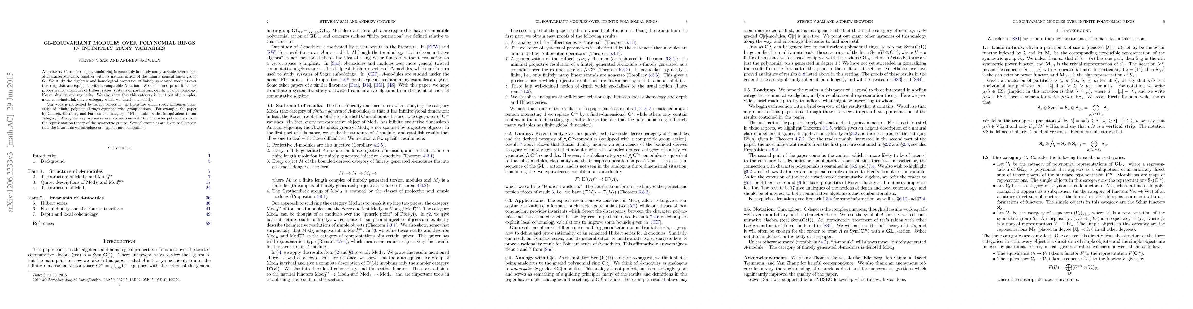 This paper investigates finitely generated modules over a polynomial ring in infinitely many variables with a natural action of the infinite general linear group, establishing finiteness properties and connections to homological algebra, Koszul duality, and representation theory. It reveals that the studied category is equivalent to a simpler quiver category, with explicit examples demonstrating the computability of the introduced invariants.