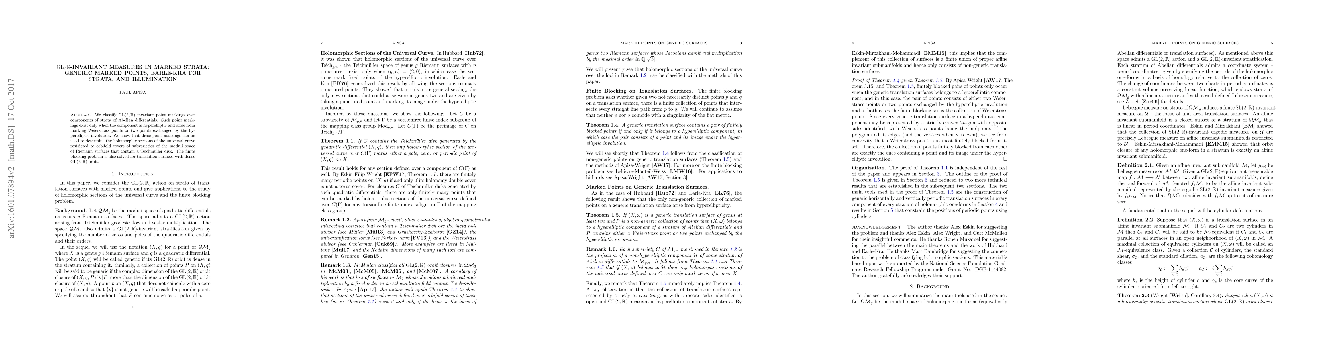 The paper classifies GL(2,R) invariant point markings in hyperelliptic strata of Abelian differentials, demonstrating their role in determining holomorphic sections of the universal curve and solving the finite blocking problem for translation surfaces with dense orbits.