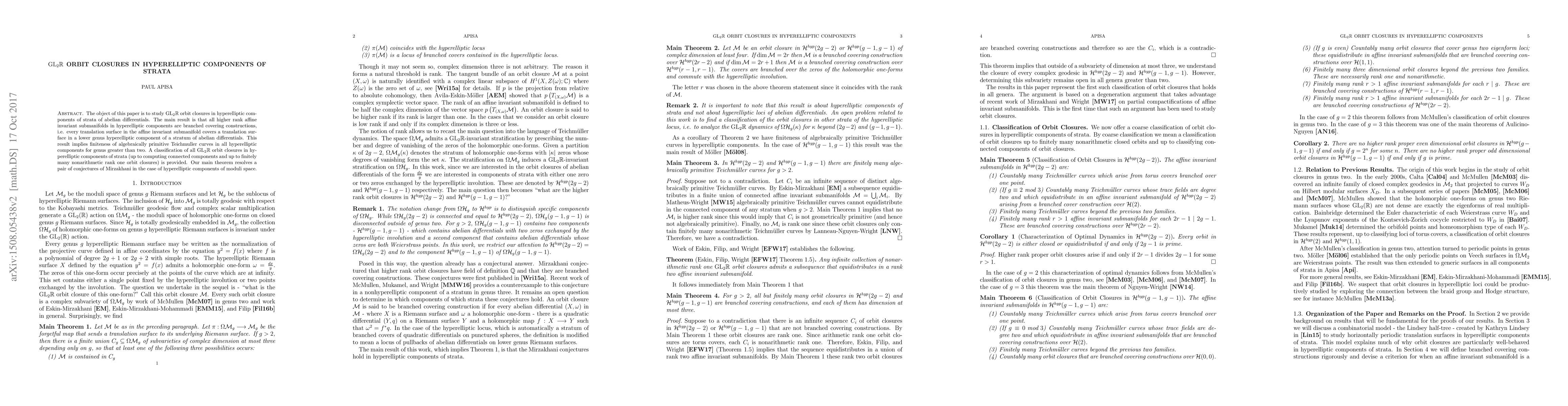 This paper studies GL(2,R) orbit closures in hyperelliptic components of strata of abelian differentials, proving that higher rank affine invariant submanifolds are branched coverings and providing a classification of these closures. The result resolves Mirzakhani's conjectures for hyperelliptic components and implies finiteness of algebraically primitive Teichmüller curves for genus greater than two.