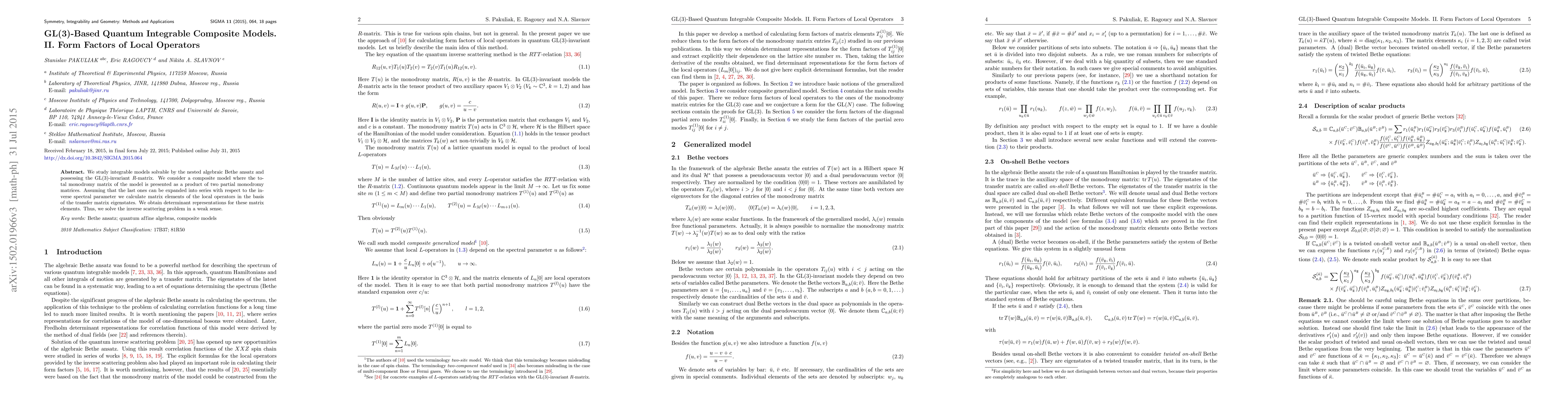 This paper explores integrable composite models solvable via the nested algebraic Bethe ansatz with a GL(3)-invariant R-matrix. It calculates matrix elements of local operators in the transfer matrix eigenstates, obtaining determinant representations and solving the inverse scattering problem in a weak sense.