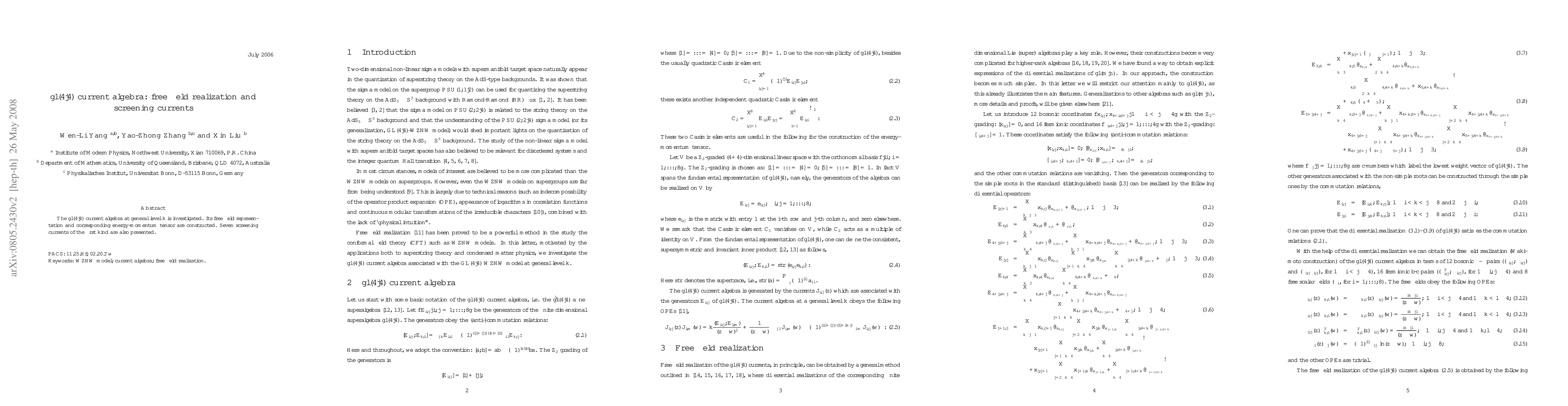 This paper investigates the $gl(4|4)$ current algebra at general level k, constructing a free field representation and energy-momentum tensor, and presents seven screening currents of the first kind.