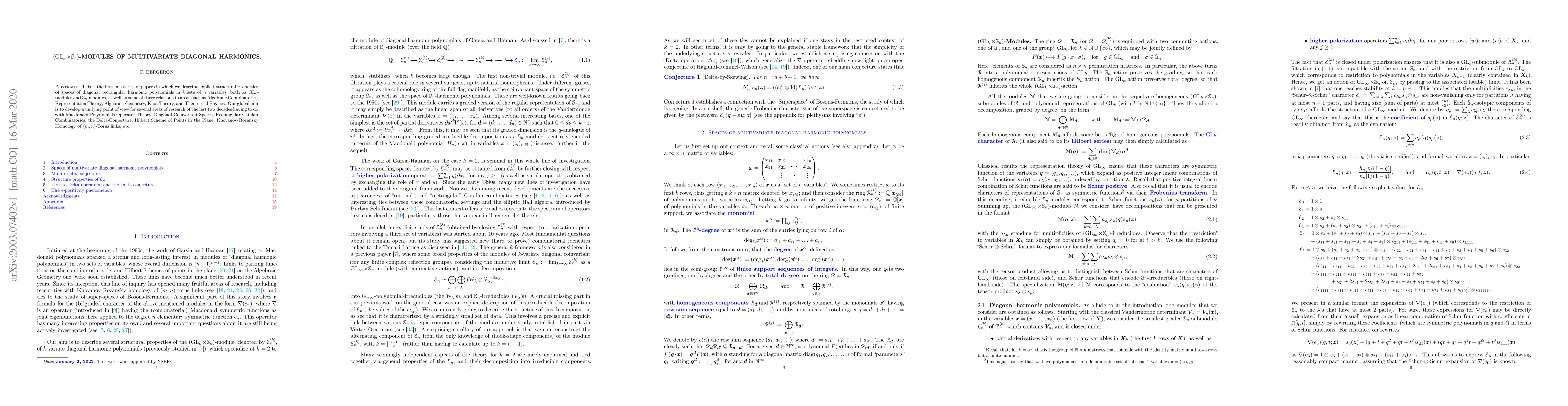 This is the first in a series of papers in which we describe explicit structural properties of spaces of diagonal rectangular harmonic polynomials in $k$ sets of $n$ variables, both as $GL_k$-modules and $S_n$-modules, as well as some of there relations to areas such as Algebraic Combinatorics, Representation Theory, Algebraic Geometry, Knot Theory, and Theoretical Physics. Our global aim is to develop a unifying point of view for several areas of research of the last two decades having to do with Macdonald Polynomials Operator Theory, Diagonal Coinvariant Spaces, Rectangular-Catalan Combinatorics, the Delta-Conjecture, Hilbert Scheme of Points in the Plane, Khovanov-Rozansky Homology of $(m,n)$-Torus links, etc.