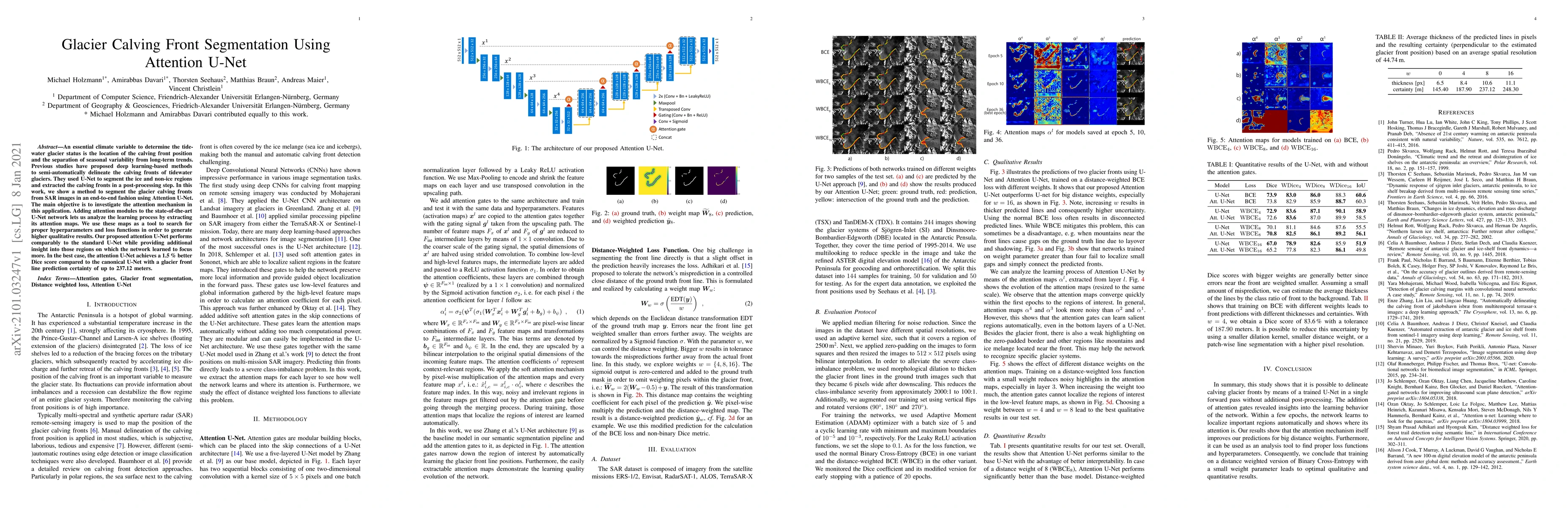 This paper proposes an Attention U-Net for segmenting tidewater glacier calving fronts from SAR images, achieving an end-to-end segmentation process. The attention mechanism provides insights into the network's focus areas, leading to a 1.5% better Dice score and a prediction certainty of up to 237.12 meters.