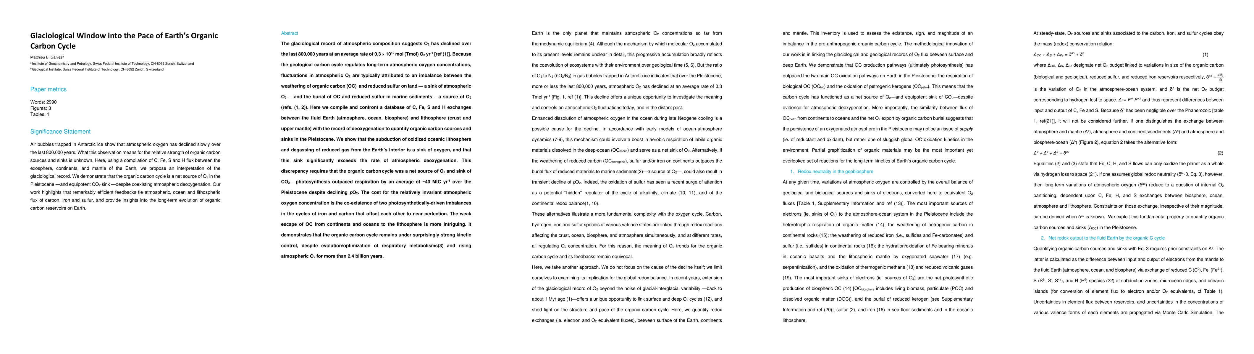 This paper examines the glaciological record to determine the long-term trends in atmospheric oxygen and their relation to the organic carbon cycle. It finds that the organic carbon cycle has been a net source of oxygen, maintaining relatively constant atmospheric oxygen levels by outpacing respiration with photosynthesis over the past 50 million years.