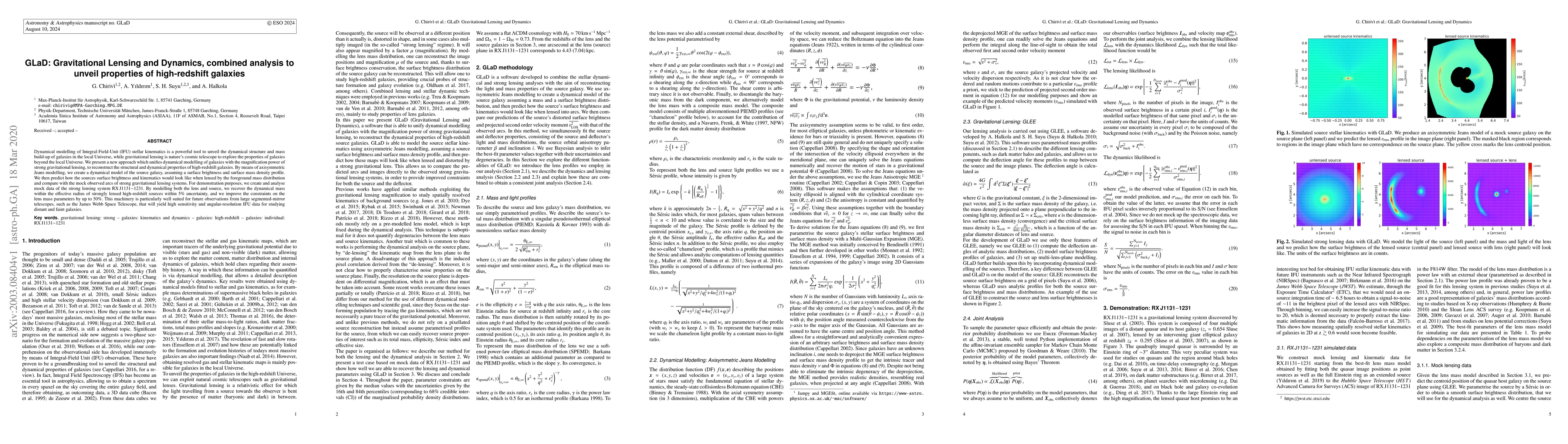 The paper introduces GLaD, a combined analysis method using gravitational lensing and dynamics to unveil properties of high-redshift galaxies. It employs axisymmetric Jeans modelling to reconstruct structural and dynamical properties of these galaxies, achieving a 5% uncertainty in dynamical mass and up to a 50% improvement in lens mass parameter constraints.